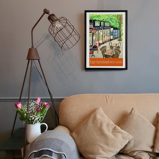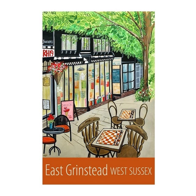 A contemporary travel poster style print of the lovely high street in East Grinstead, from my own original acrylic painting.
