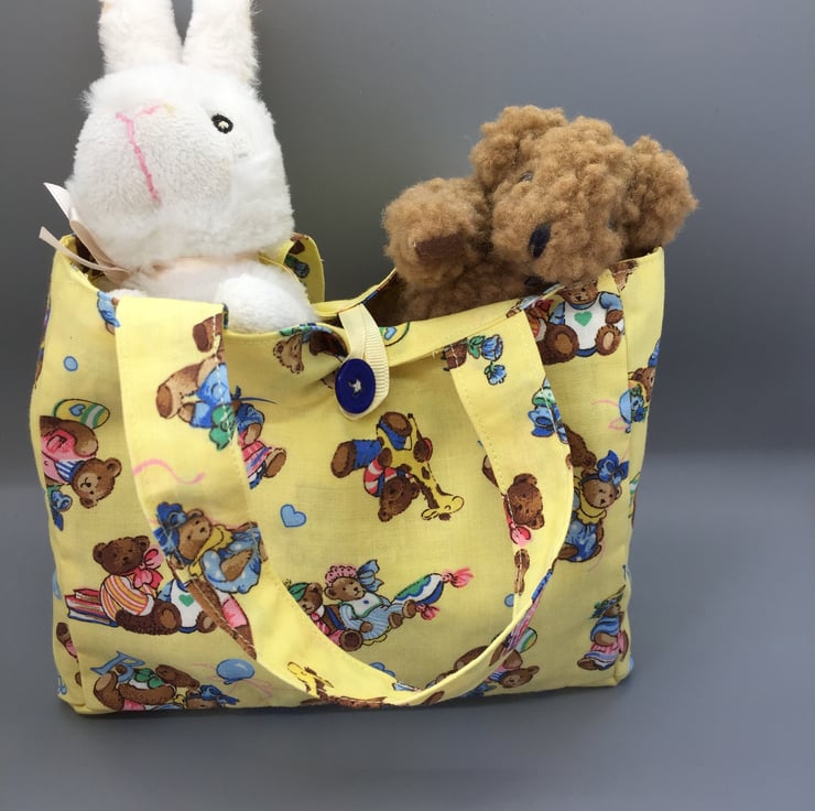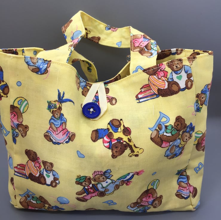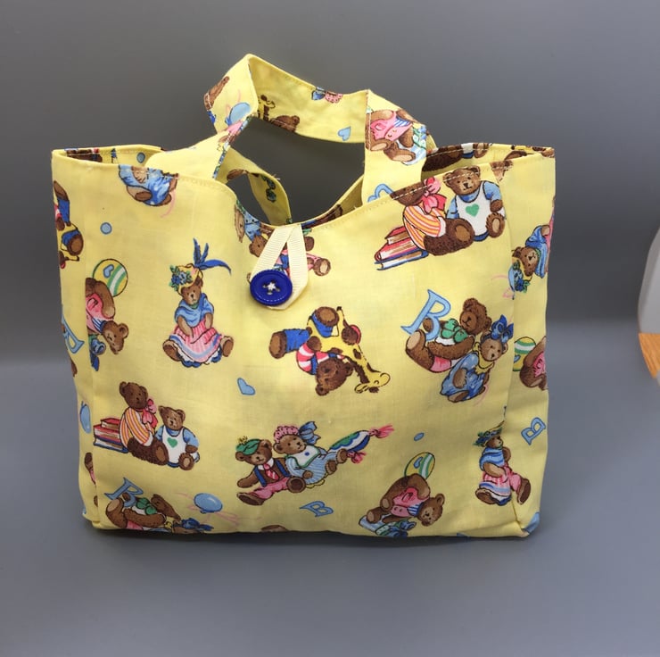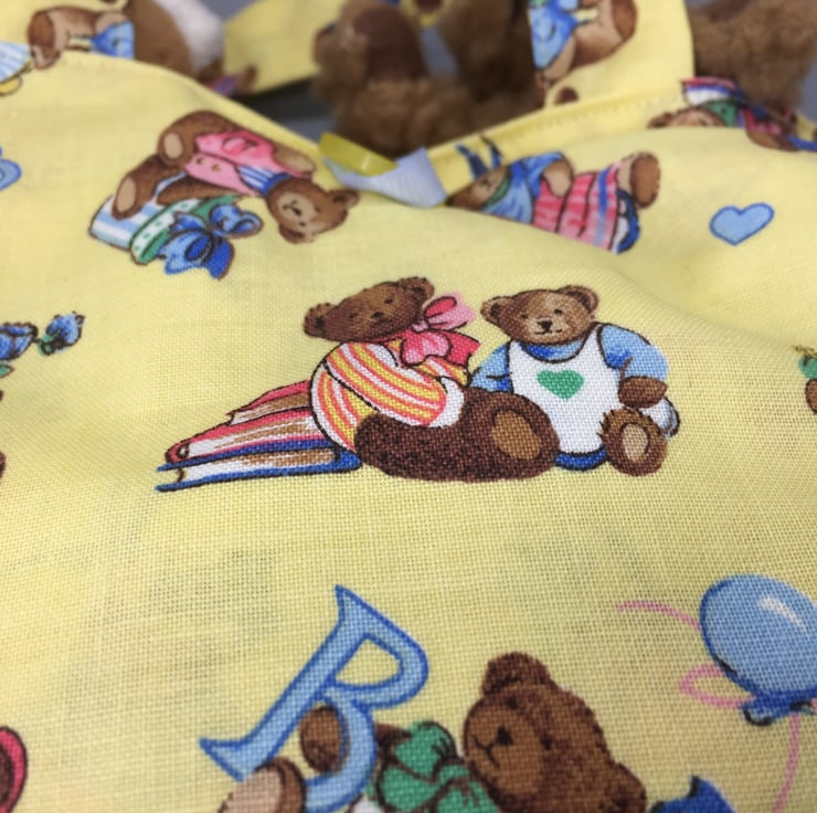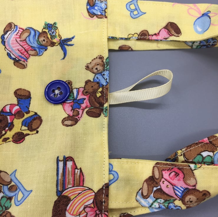 A small gift bag, made of a beautiful nursery fabric, multicoloured teddy bears on a yellow background lined with the same a yellow ribbon to close with a royal blue button.