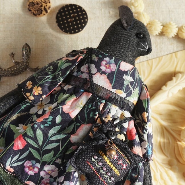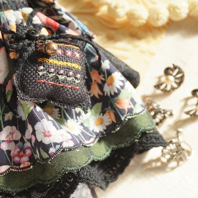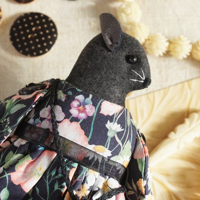 This is Ellaria, a tiny midnight mouse. She is a hand embroidered mouse with little leather ears and tail. She is dressed in a Liberty tana lawn cotton called Jude's Garden, the midnight version. New for winter 2022, this tana lawn is a representation of an English meadow with flowers wandering across a black ground. She has coordinating underskirts in green shot cotton, black tulle mesh and white cotton lace bloomers. Her dress is finished with organza ribbon, tiny buttons and little leather shoes. She is a black mouse with black ears and tail, grey wishkers and an embroidered black nose.