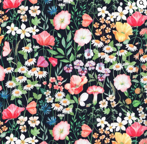 I love colour and I am particularly drawn to the delicate prints you can find in Liberty Tana Lawn, a super light weight cotton. However, sometimes I find myself attracted to less colourful prints and I buy them and never use them. So the midnight series was born, little creatures in blacks and greys with dark prints that please me.Created in watercolour paints, this botanical print features a variety of British wildflowers in a delicate meadow scene, reminiscent of a typical Liberty floral design.