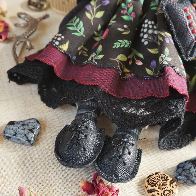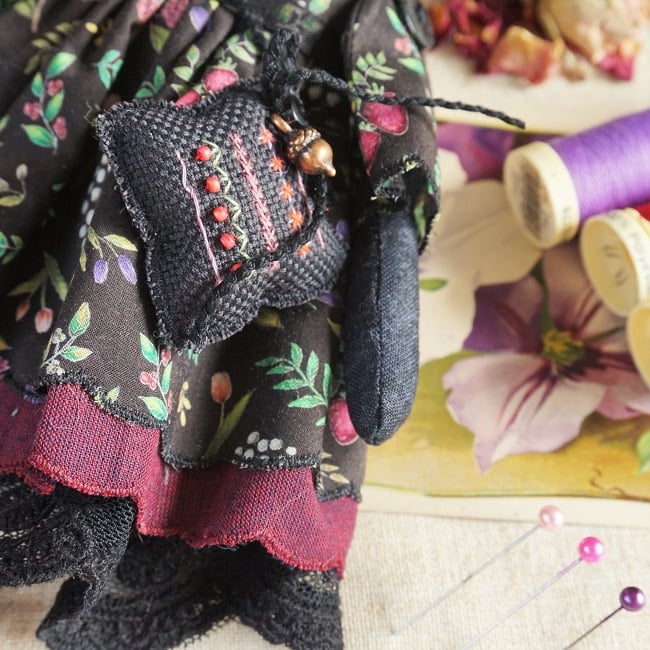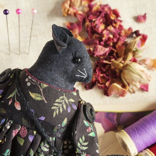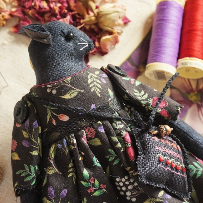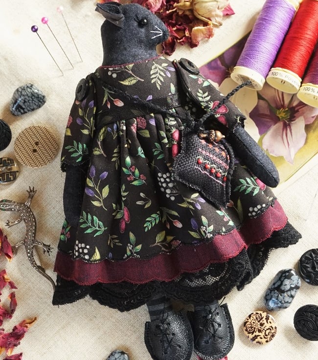 This is Callisto, a tiny midnight mouse. She is a hand embroidered mouse with little leather ears and tail. She is dressed in a Liberty tana lawn cotton called Berry Garden, the midnight version.An old print I was delighted to find the darker version, rich reds and plums - luscious. She has coordinating underskirts in mulberry shot cotton, black tulle mesh and cotton lace bloomers. Her dress is finished with organza ribbon, tiny buttons and little leather shoes. She is a black mouse with black ears and tail, grey wishkers and an embroidered black nose.