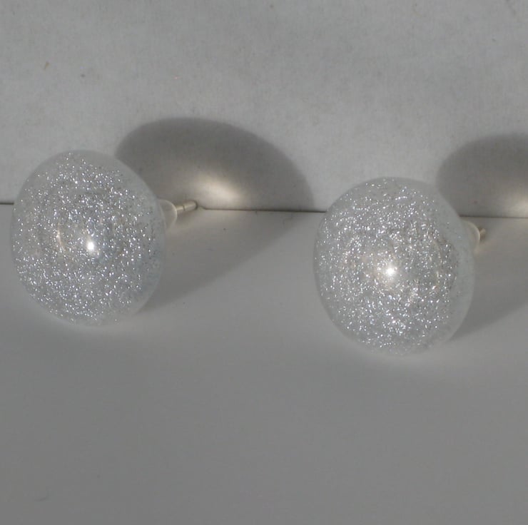 For these earrings I fused white mosaic and Bullseye glass together. They are transparent and have a fine spreckle look to the tops.