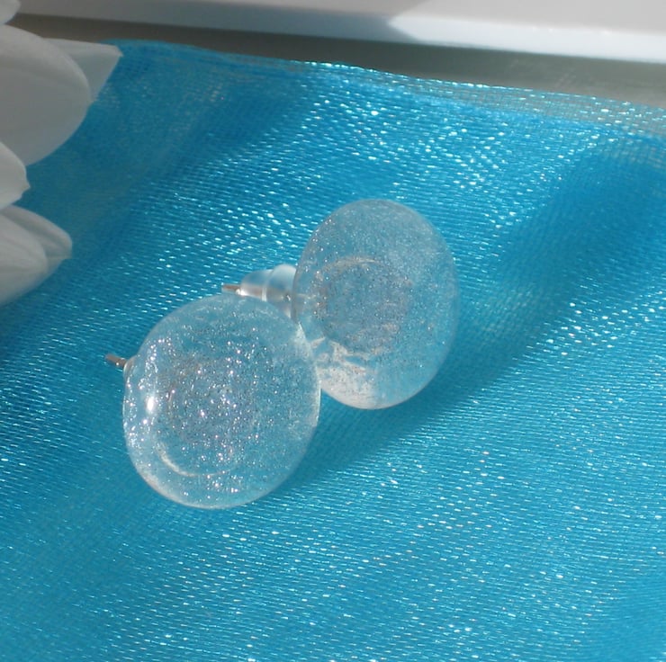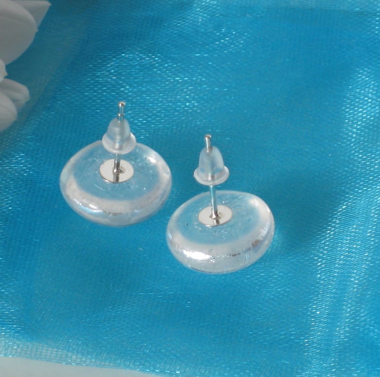 Pair of white transparent mosaic glass on clear Bullseye glass earrings. 12mm round studs. Created by kiln fusion. Sterling silver ear posts with soft rubber hypoallergenic safety stoppers.