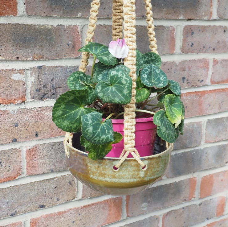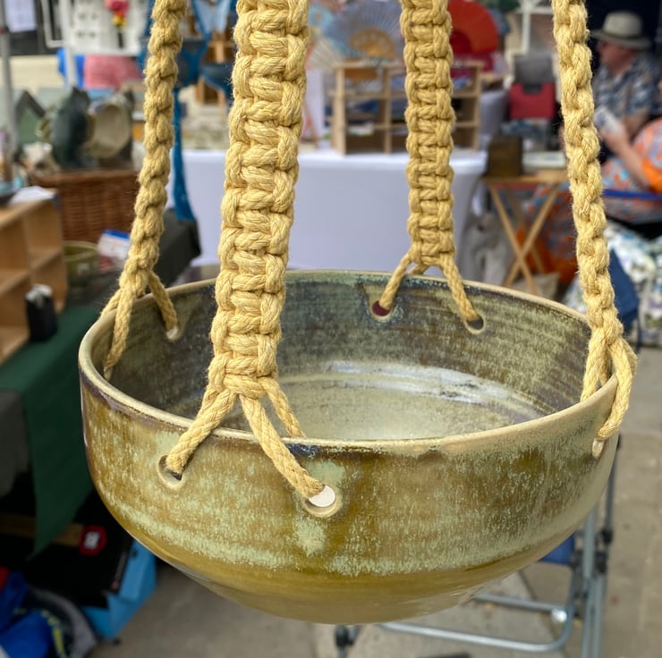 All in one bowl and hanger ! Handmade ceramic bowl made from robust high-fired stoneware clay in a natural green complemented by a hanger with 4 strands of khaki macrame.