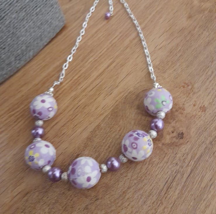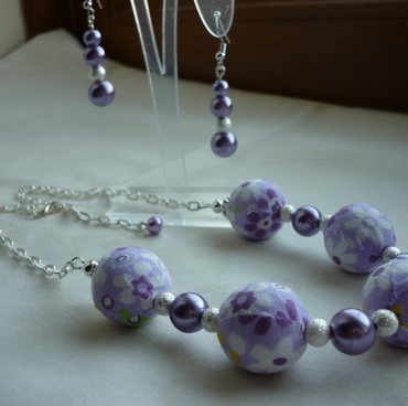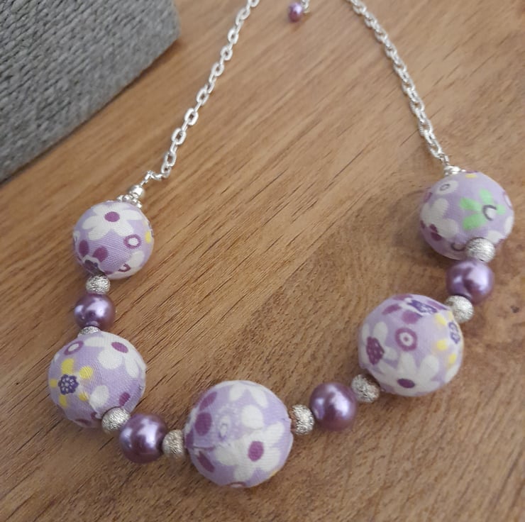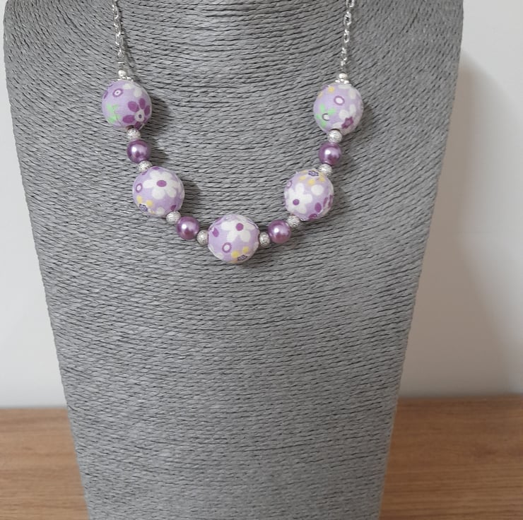 THE NECKLACE HAS BEEN MADE WITH FABRIC BEADS IN A LAVENDER FLORAL DESIGN ALONG WITH 10MM GLASS PEARLS IN LILAC PURPLE SHADE, 6MM SILVER PLATED STARDUST BEADS WHICH GIVE THE SPARKLE TO THIS NECKLACE ALONG WITH SILVER PLATED FLUTED SPACER BEADS, SILVER PLATED SPACER BALL BEADS AND SILVER PLATED FANCY TRACE CHAIN. ALL FINDINGS ARE SILVER PLATED AND NICKLE FREE.