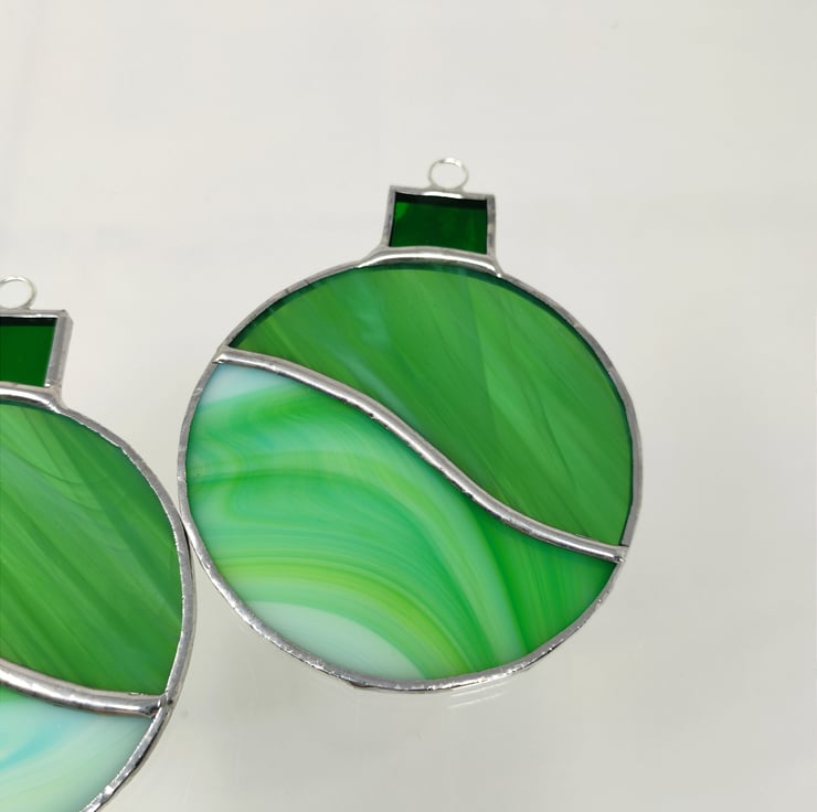 These circular two tone glass Christmas baubles have a smooth, wispy transparent green upper and a bright swirled translucent lime, white and strong green glass at the bottom. These are separated with a softly curving solder line. The neck of the bauble is cut from a mirrored bright green with a silver plated jump ring attached to the top for easy display.