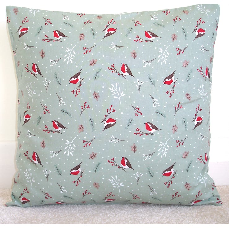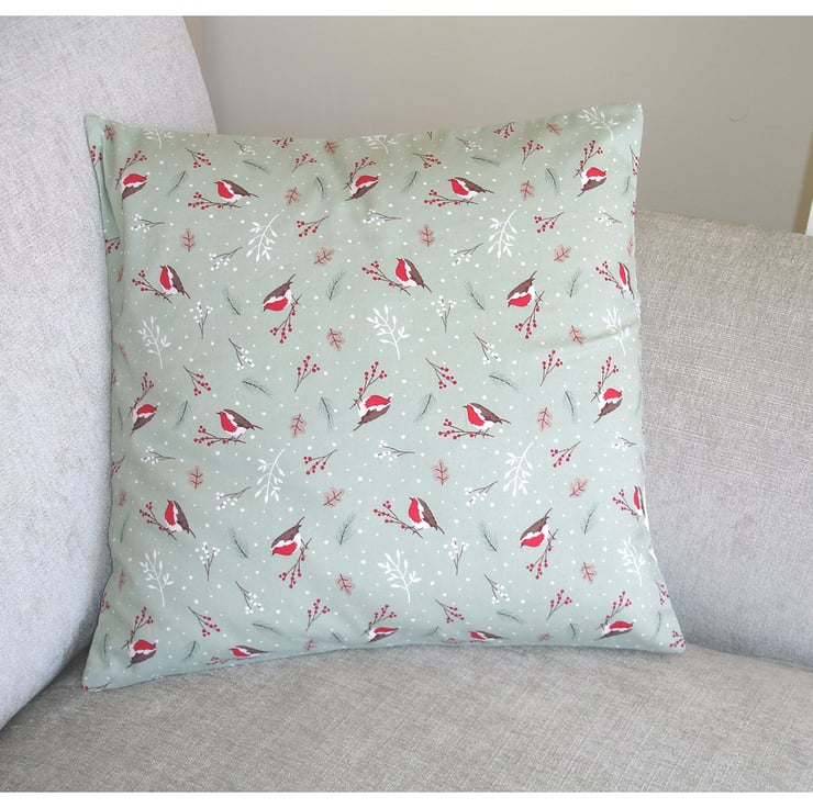 Christmas Robins in Red on a Sage Green Background. Christmas decorations on your sofa!