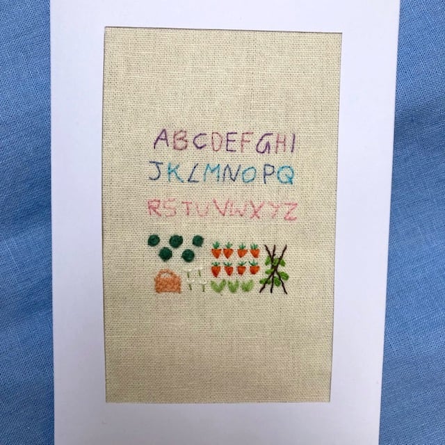 This charming, miniature Victorian sampler with its lettering and mini vegetable garden, has been hand embroidered onto cream linen and mounted in a 6" x 4" aperture greetings card. The inside of the card has been left blank for your own message. The card could also be hung as a small picture.