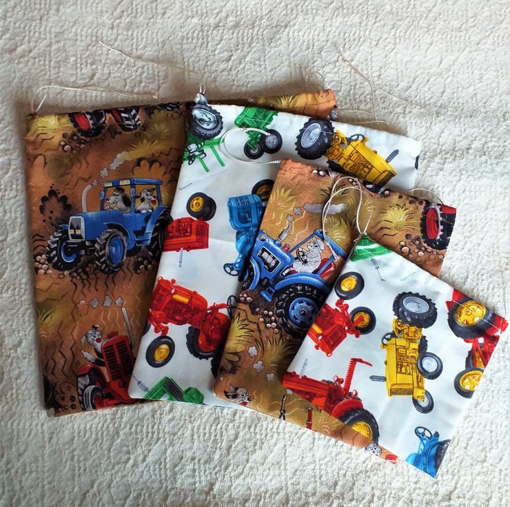 These four bags of various sizes all have tractors depicted on the fabric. Two are white with red, green, blue and yellow tractors scattered over them. The other two are an earthy brown, with red and blue tractors driven by dogs and sheep. The largest bag is brown and measures 9.5" (24 cm.) by 9" (23 cm.), and the smallest, white, is 5" square (12.5 cm.) All are made of good quality cotton, and are fully washable and reusable.