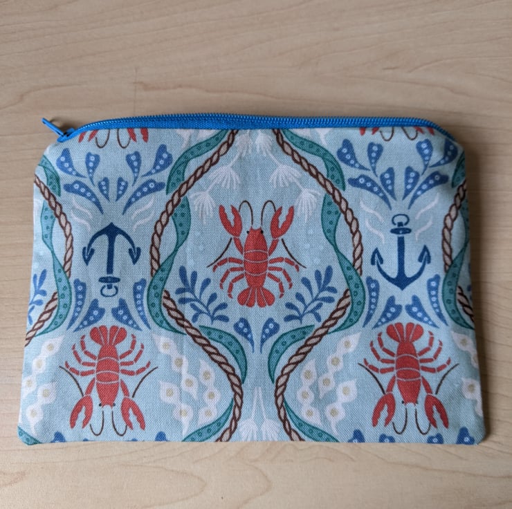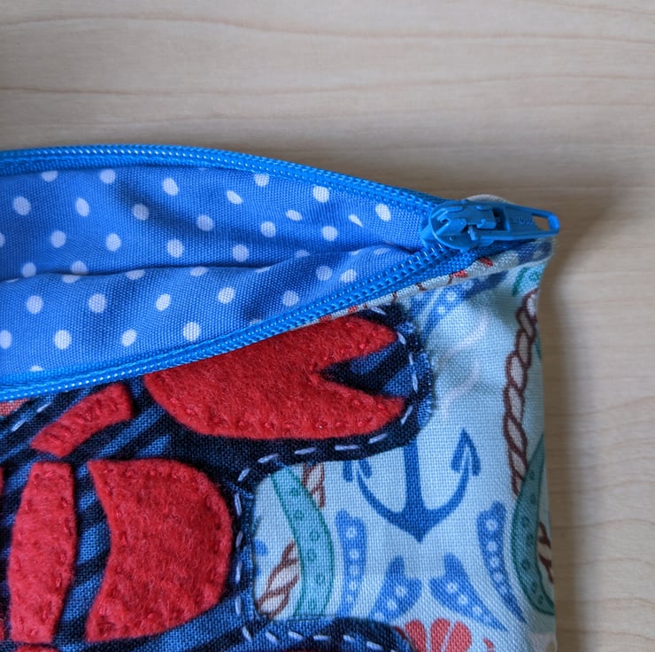 Handmade lobster coin purse with blue zip and blue polka-dot lining.