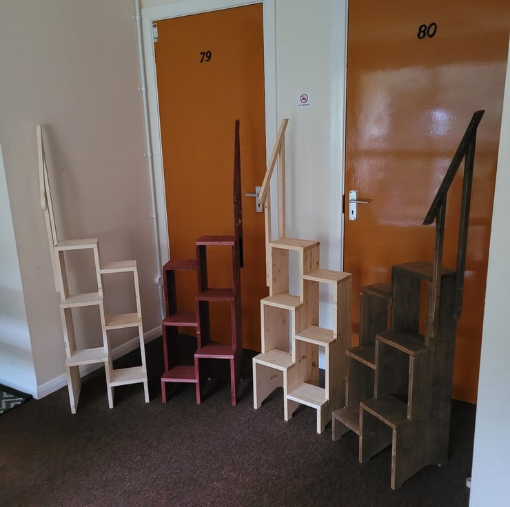 Our staggered step Up Easy "tm" step ladders are designed for safe and easy stepping up and down from one level to another, concepted out of need, for the young ones and seniors small in stature with disabilities or mobility difficulties..anyone really with a need to reach up.
