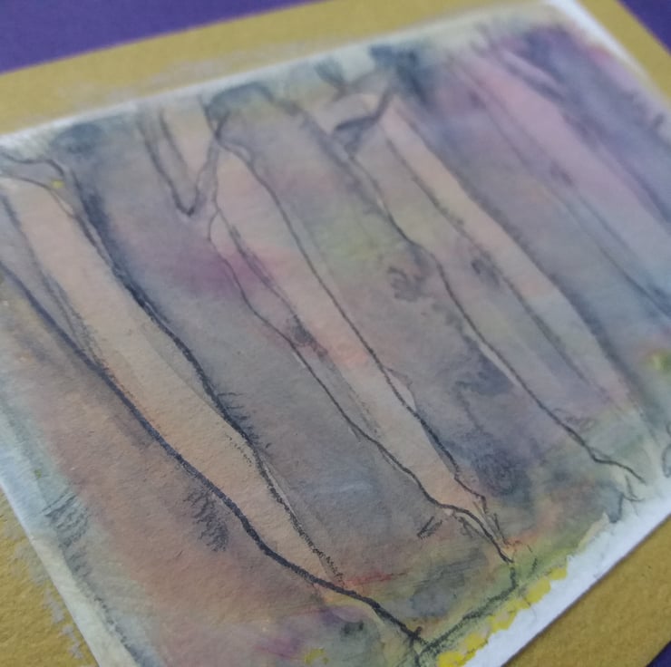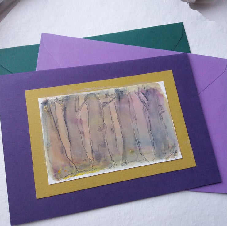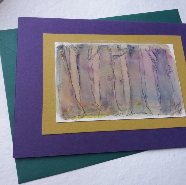 this greetings card is made with a small piece of original art (not a print) blank inside for your own message. the little treescape is created using watercolour and charcoal.