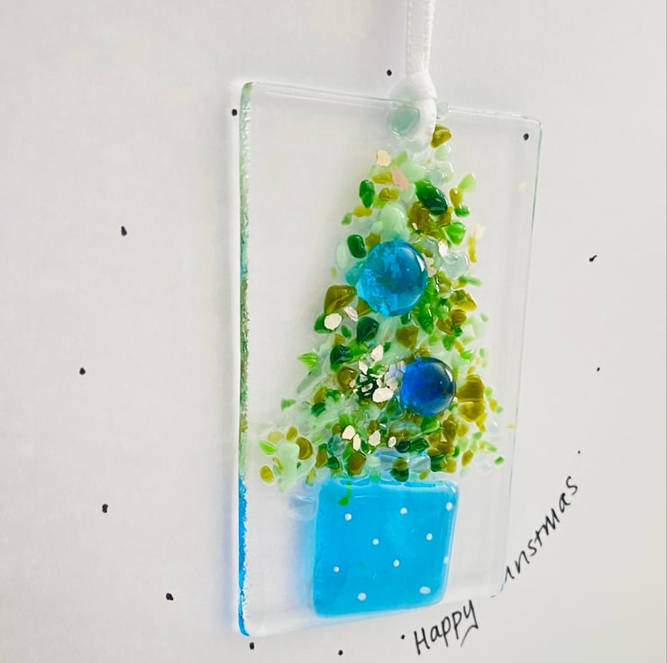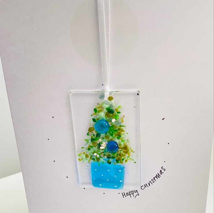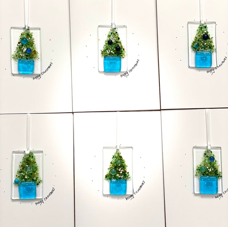 Hand crafted fused glass Christmas cards with detachable Christmas tree ornament . A lovely was to give a fused glass gift and a card in one ! Each tree is made from special art glass to maintain the lovely bright colours. Once the card is no longer needed , simply detach the fused glass hanging and put on your tree . Each card is 5 in x7 inch and each hanging is approx 3.5 inch .