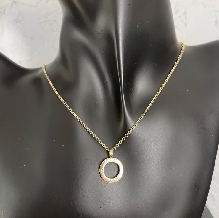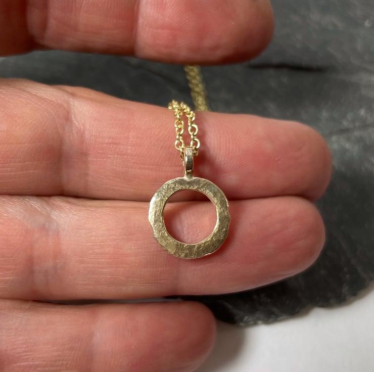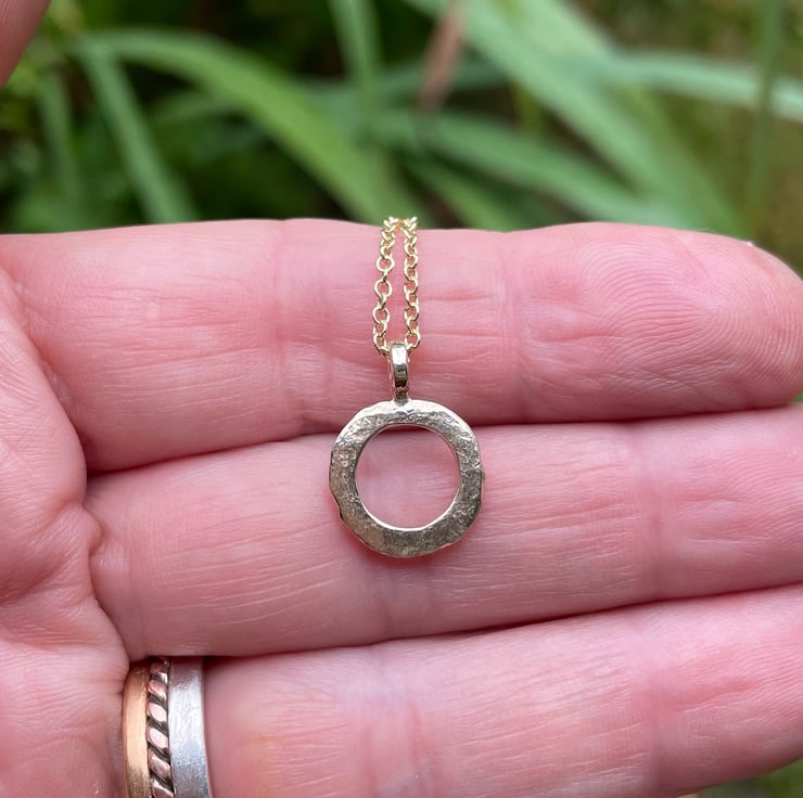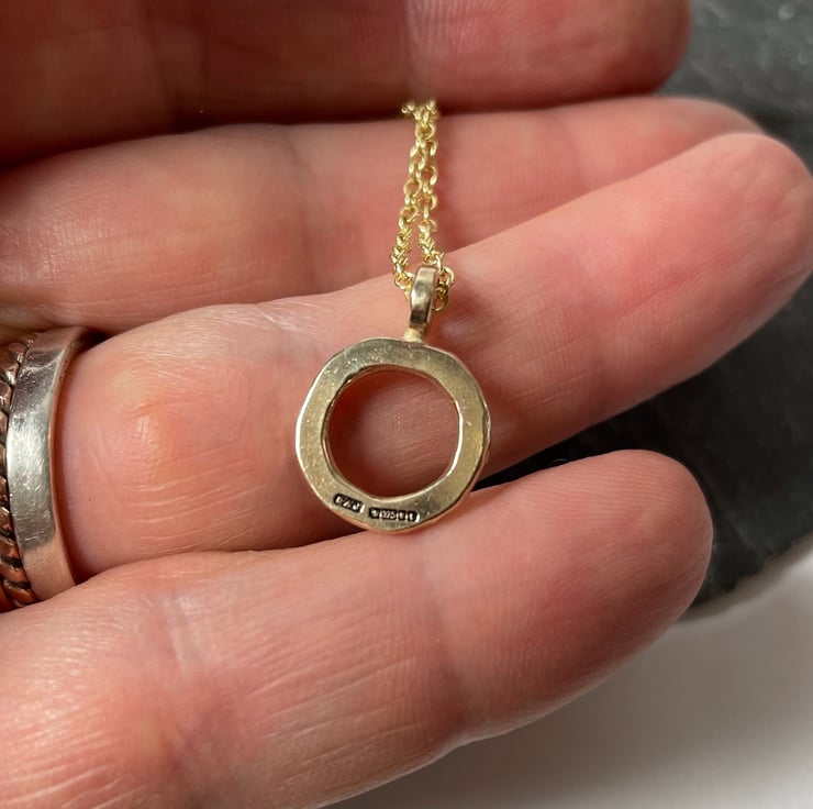 I have made this pendant from thick 9ct gold wire that has been shaped and hammered flat. I have soldered a bail to the top and have hung it on a robust trace chain.