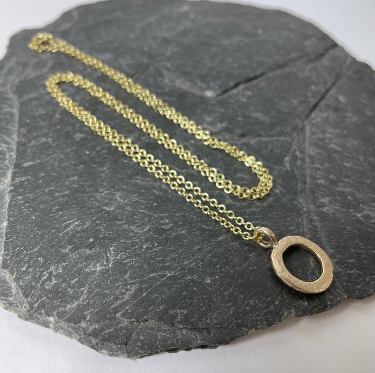A 9ct gold pendant in the shape of an O hung from an 18” trace chain.