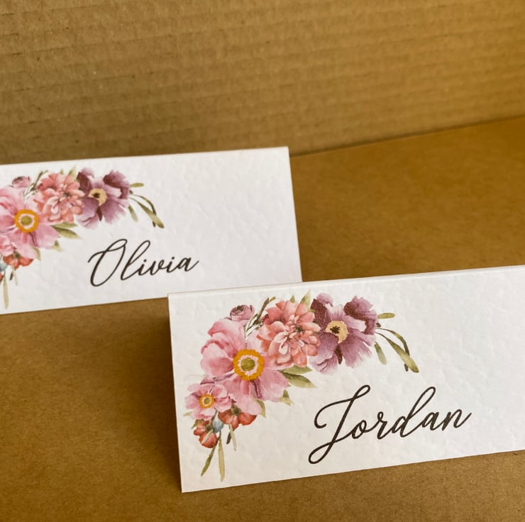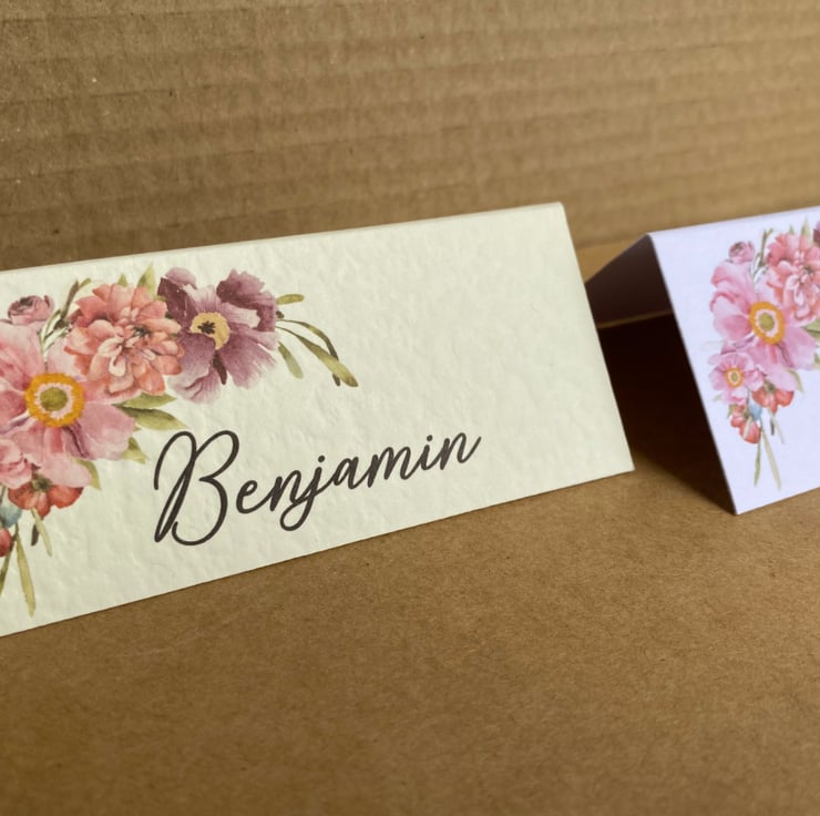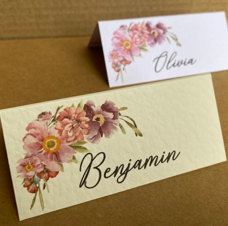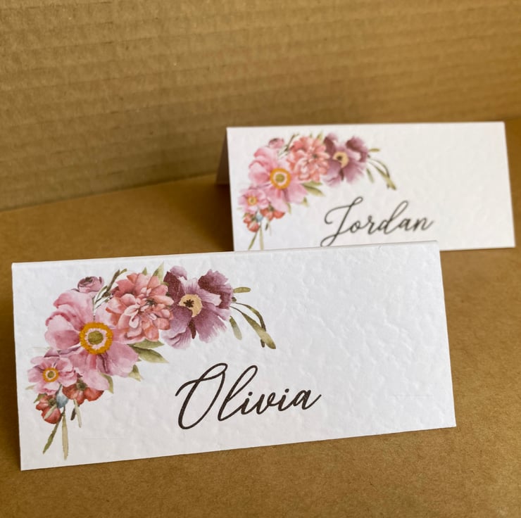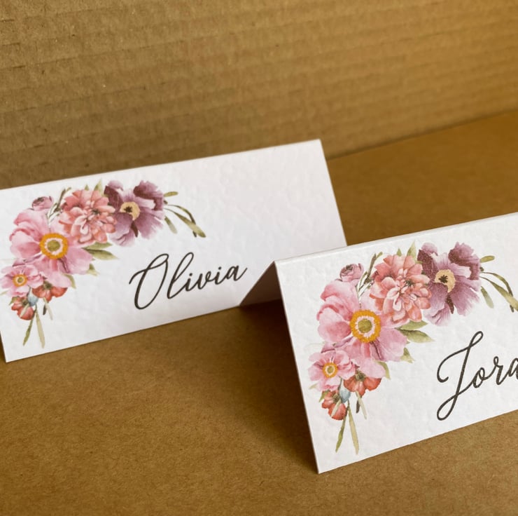 Set of 6 x coral, pink and purple mauve colour flowers custom name wedding/birthday/event table place cards.