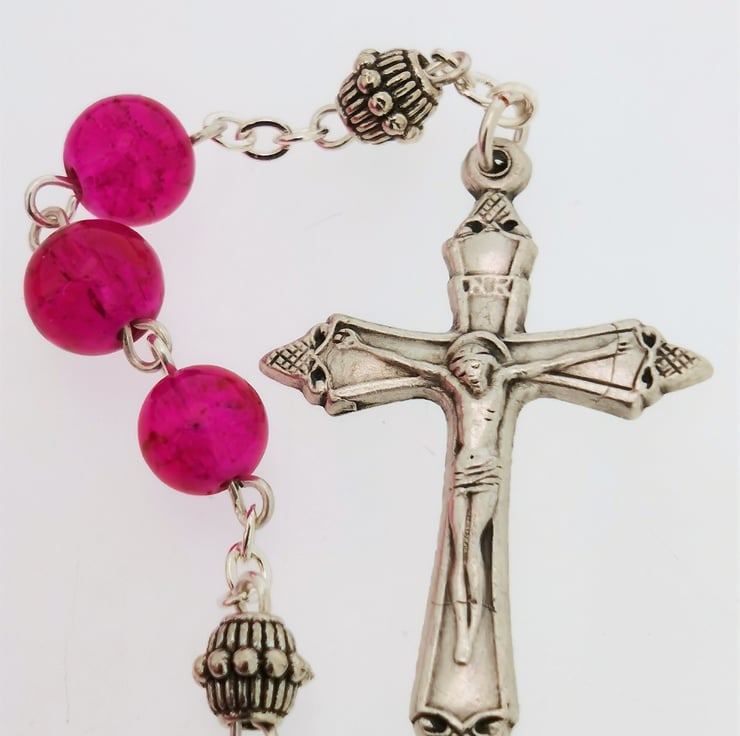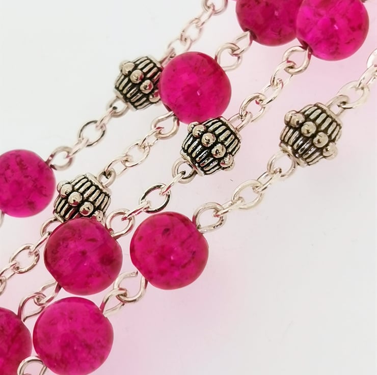 Rosary, handmade with 8mm round hot pink crackle glass beads and silver-coloured spacer beads inbetween decades. Silver-coloured crucifix and centre medal.