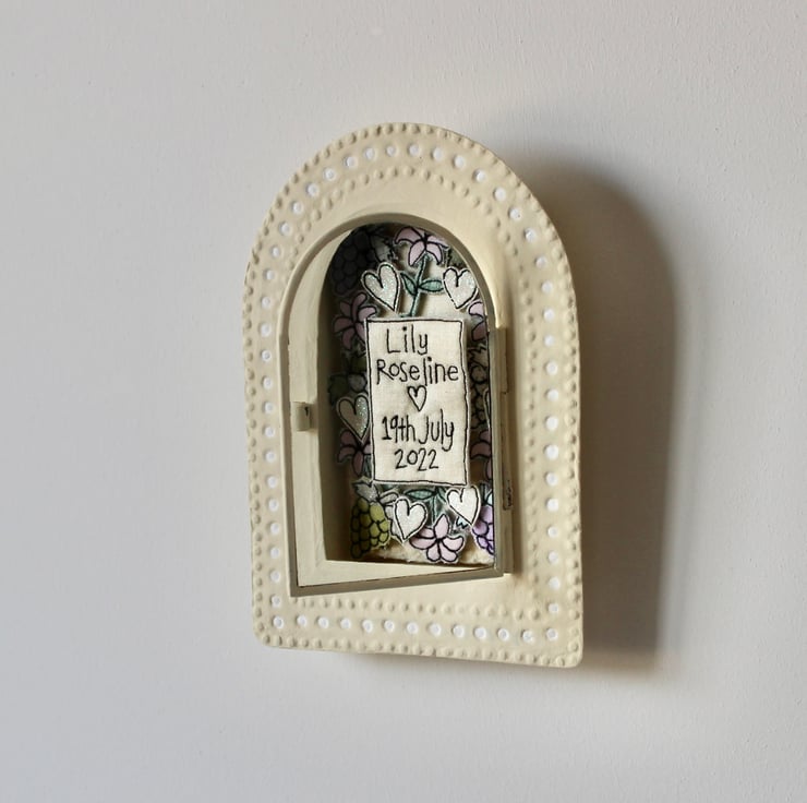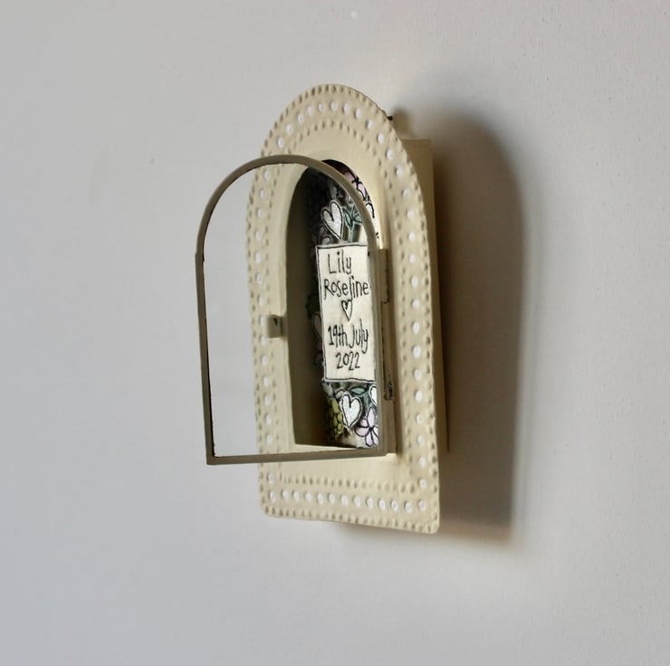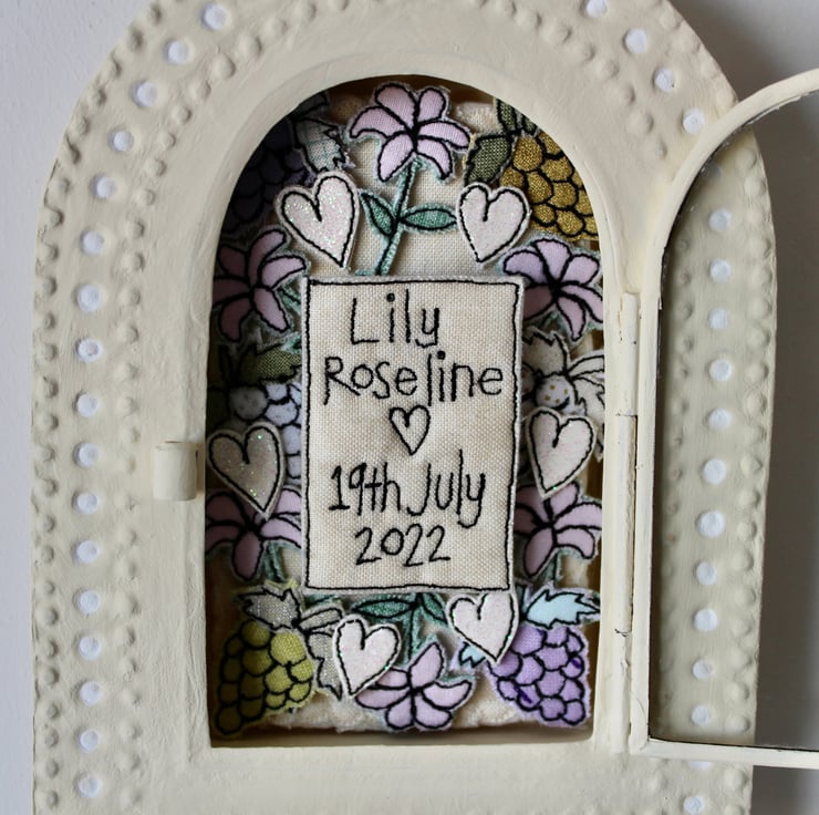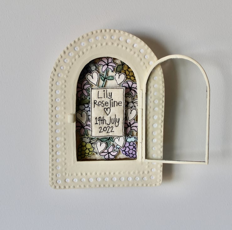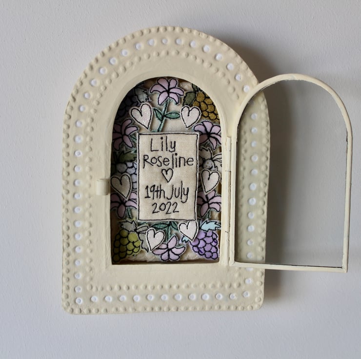 A handmade and painted metal nichos, with a hinged glass door encapsulating hearts, flowers and grapes, with the sewn words 'Lily Roseline...19th July 2022'. With hand painted white circles around the arch of the frame.