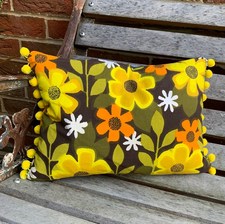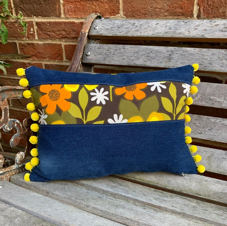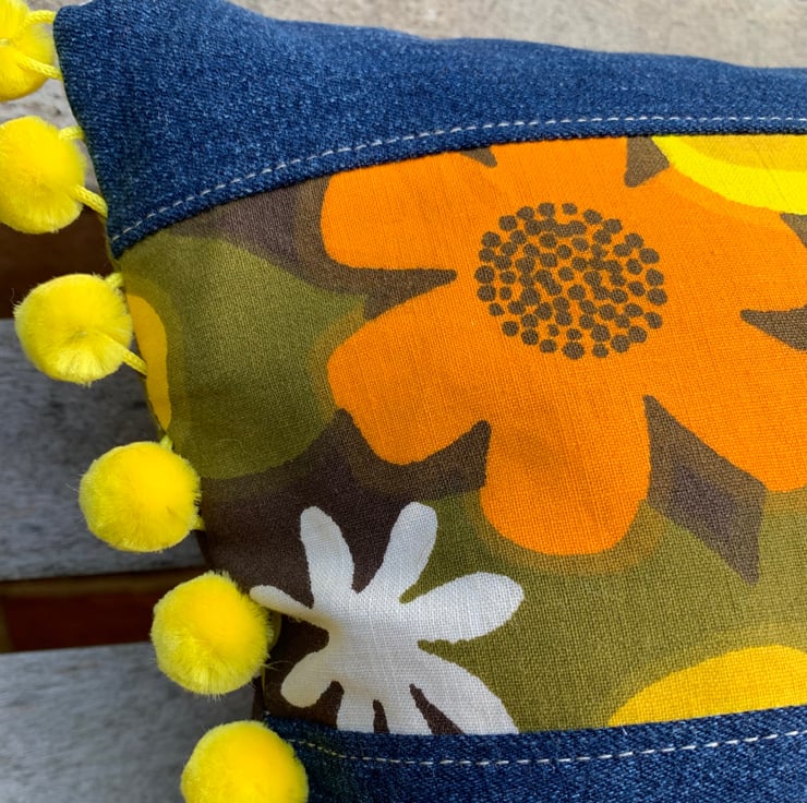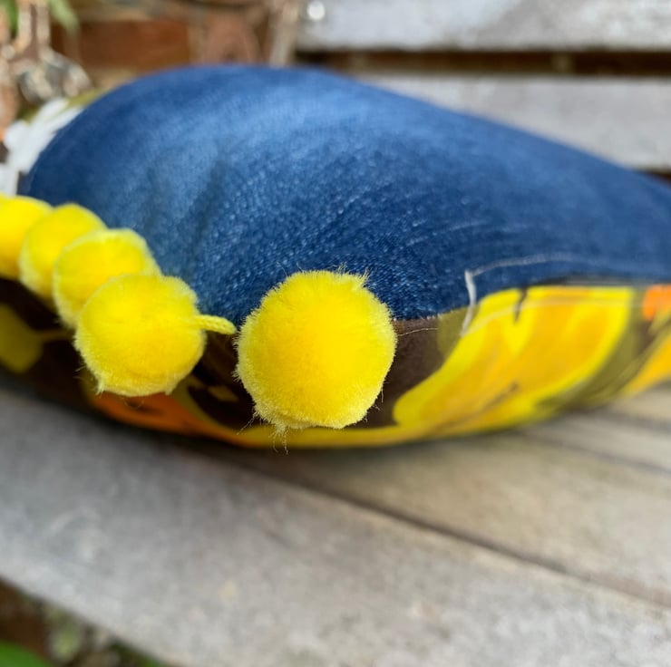 Vibrant feature cushion made from a small piece of reclaimed retro cotton and denim from discarded jeans. The end are trimmed with velvety yellow pompoms.