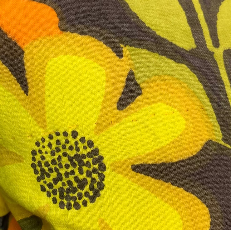 This retro cotton was reclaimed from a curtain and has a faint line where the stitching was picked out (see photo).