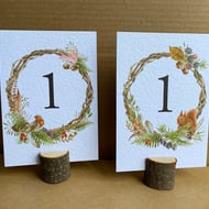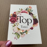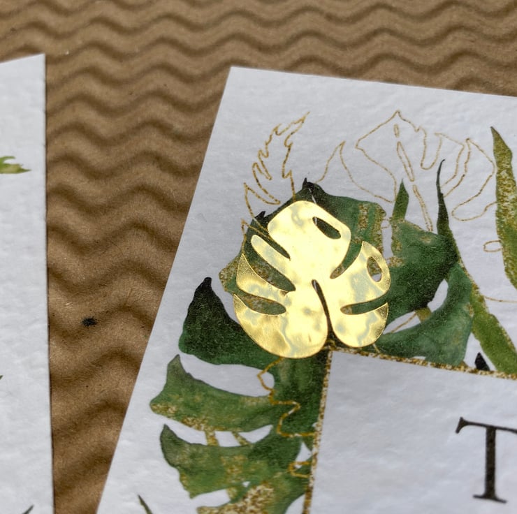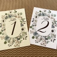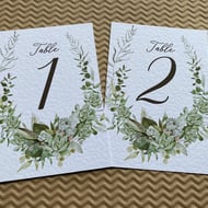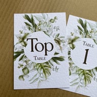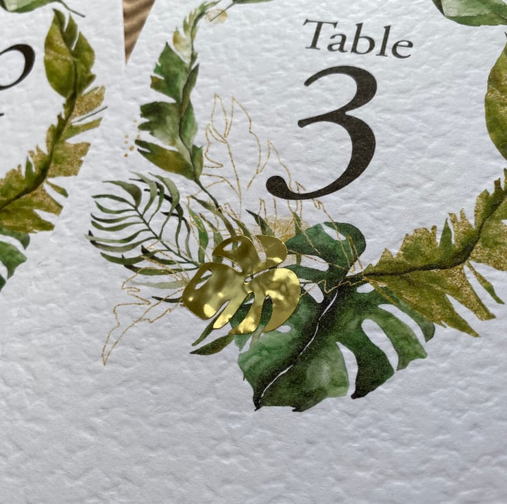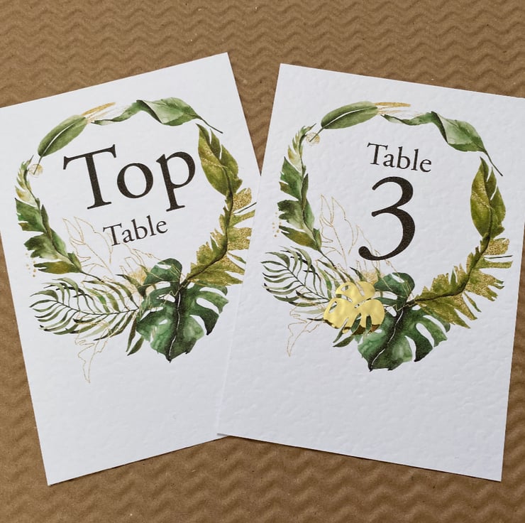 WEDDING table numbers, printed on A6 size cards. Tropical palm leaves, botanical foliage frames greenery, rustic wedding theme design.