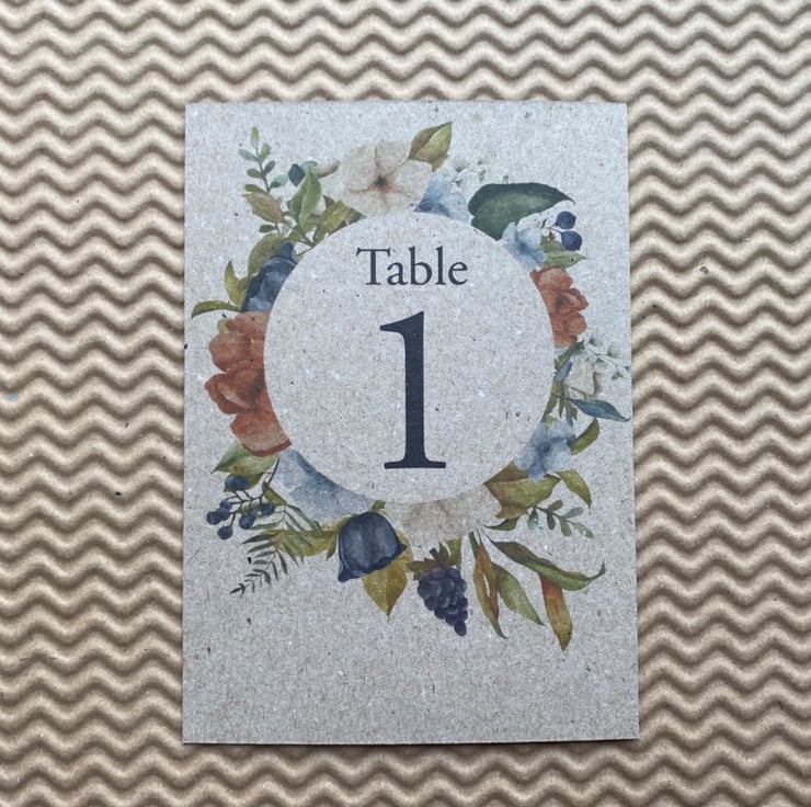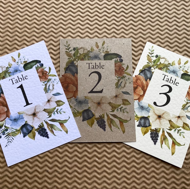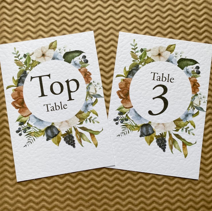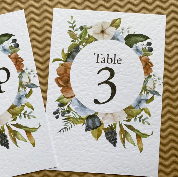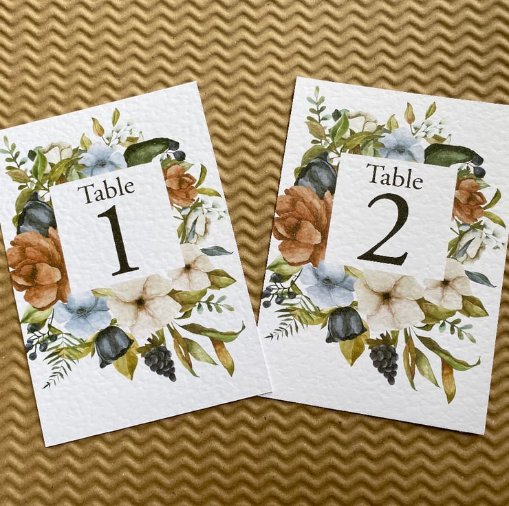 WEDDING table numbers, printed on A6 size cards.Burnt orange and navy blue flowers, foliage frames greenery, rustic wedding theme design.