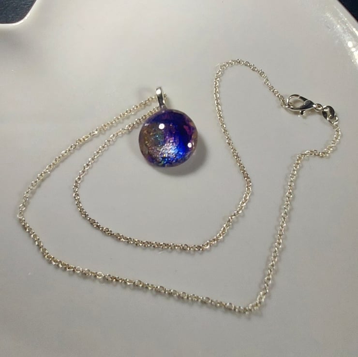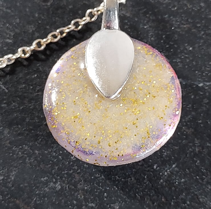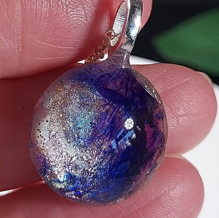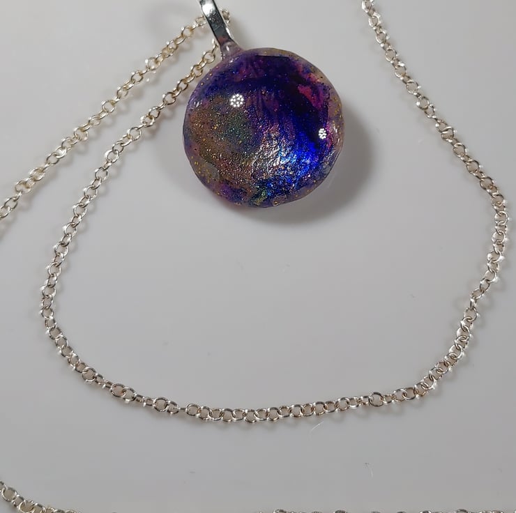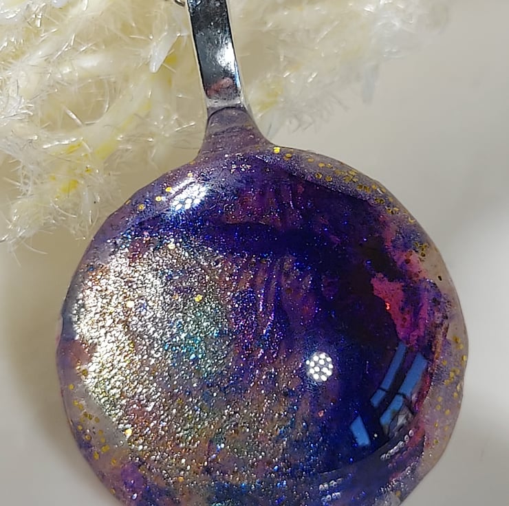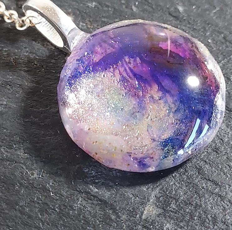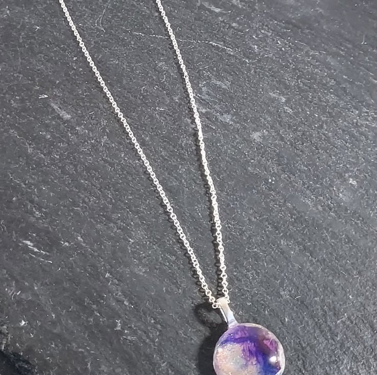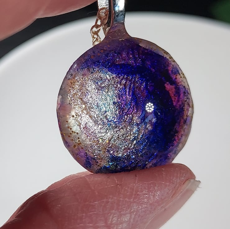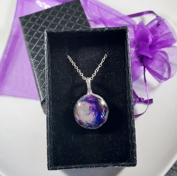 This pendant necklace uses beautiful alcohol inks in purples and gold painted on a glass tile. The tile is then sealed on the back with gold and white resin to protect it. The pendant is hung on an 18" silver plated chain. The necklace comes in a smart little black gift box and a pretty organza bag. Due to the nature of the piece, it should be removed when showering etc.