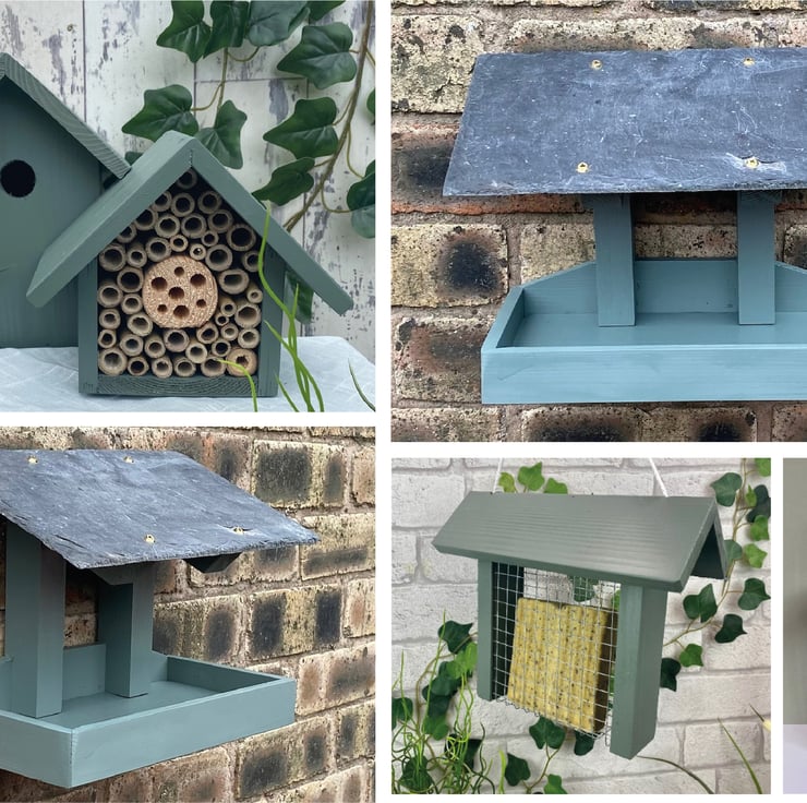 This Bird Lover Set comes with a Mounted Bird Table, Bird Box, Bee Hotel , Suet Bird Feeder & Peanut Feeder. All in Wild Thyme.