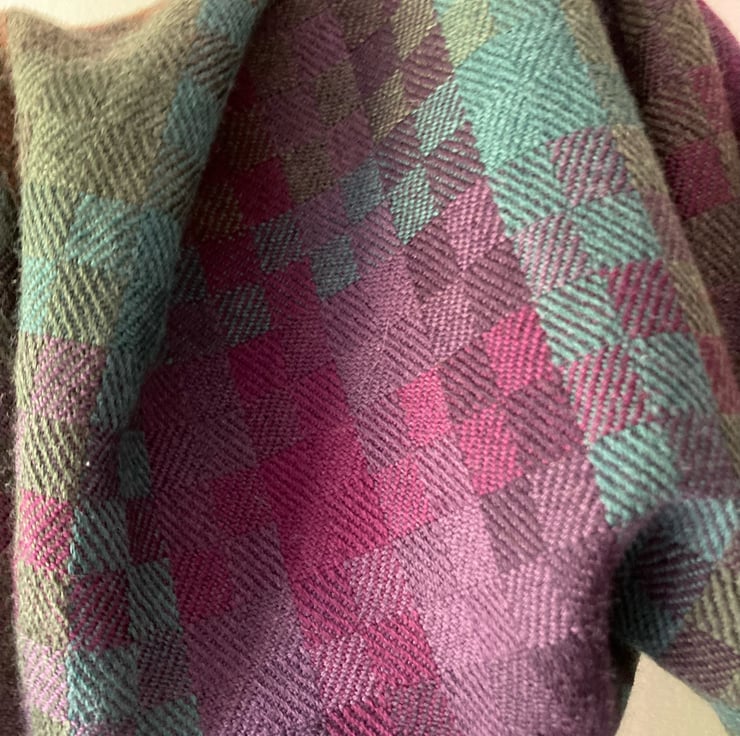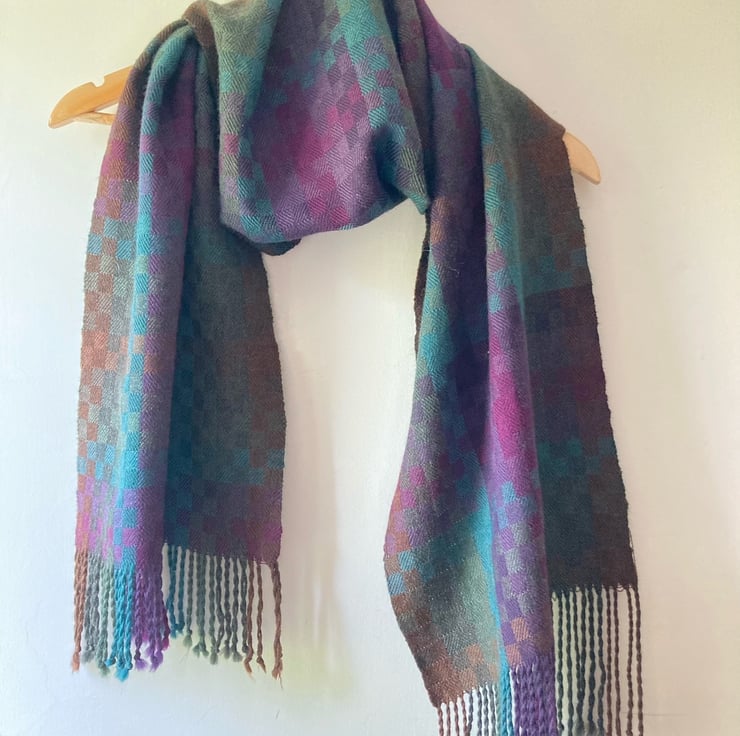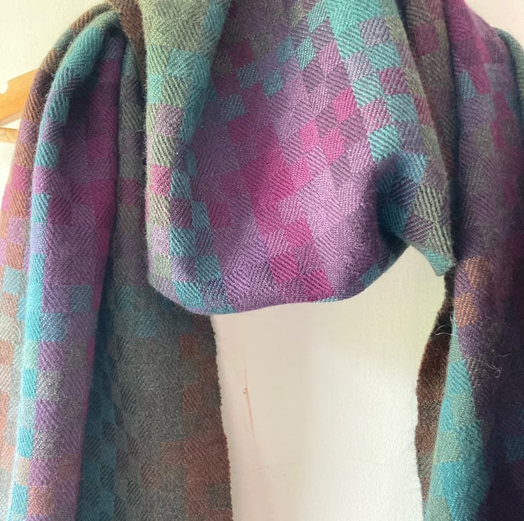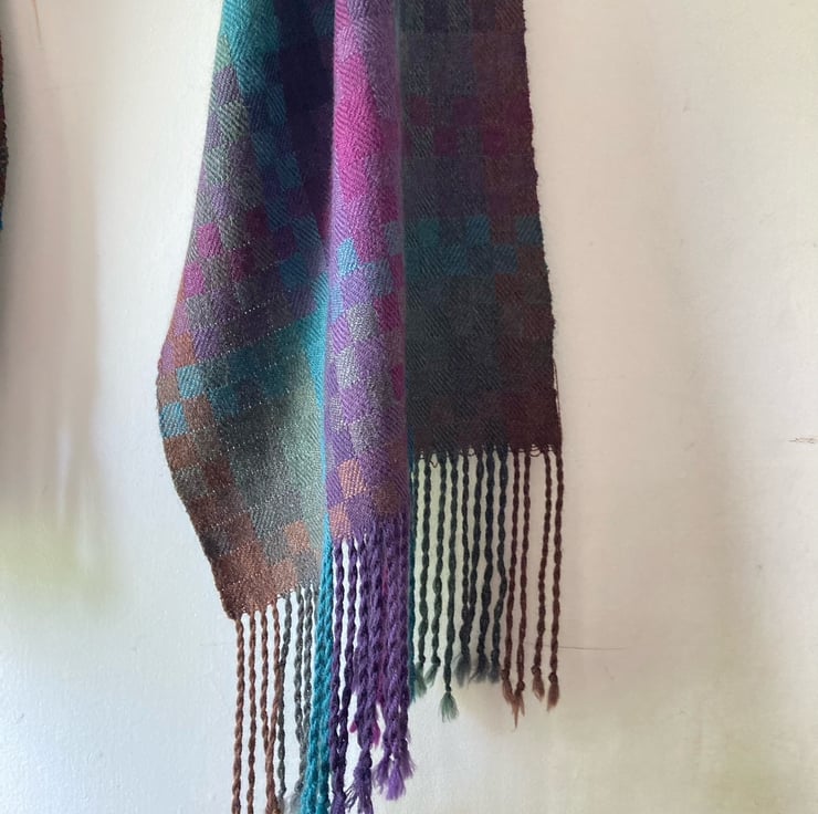 Handwoven from very fine, soft merino wool in a tiny block twill draft in five subtle autumnal shades of the moorland heather in bloom. Strines Moor is a soft scarf for looping twice around your neck on a long walk. Merino is great for folk with sensitive skin as it is not itchy and regulates temperature perfectly.