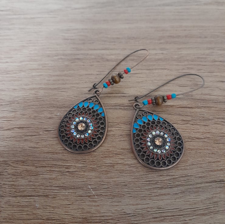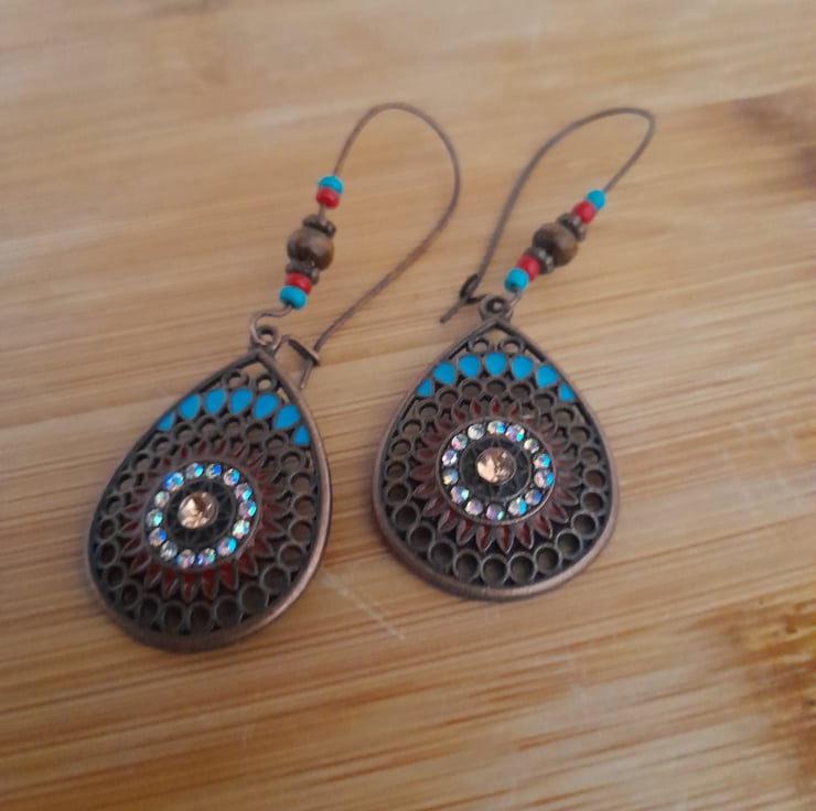 THESE UNIQUE ONE PAIR ONLY EARRINGS HAVE BEEN PUT TOGETHER BY MYSELF USING ANTIQUE COPPER TEARDROP SHAPE EARRING CHARMS WITH ADDED SMALL GLASS AB CRYSTALS, SPECKLES OF TURQUOISE ENAMEL, SEED BEADS IN TURQUOISE AND RED, COPPER SPACER BEADS AND LITTLE WOODEN BEADS AND FINISHED WITH ANTIQUE COPPER KIDNEY SHAPED EARRING WIRES.