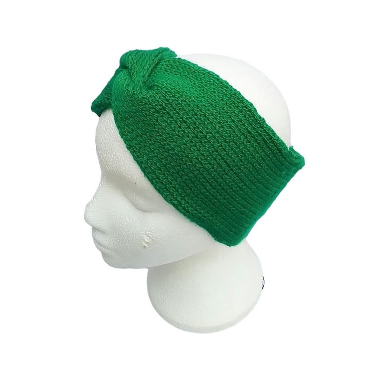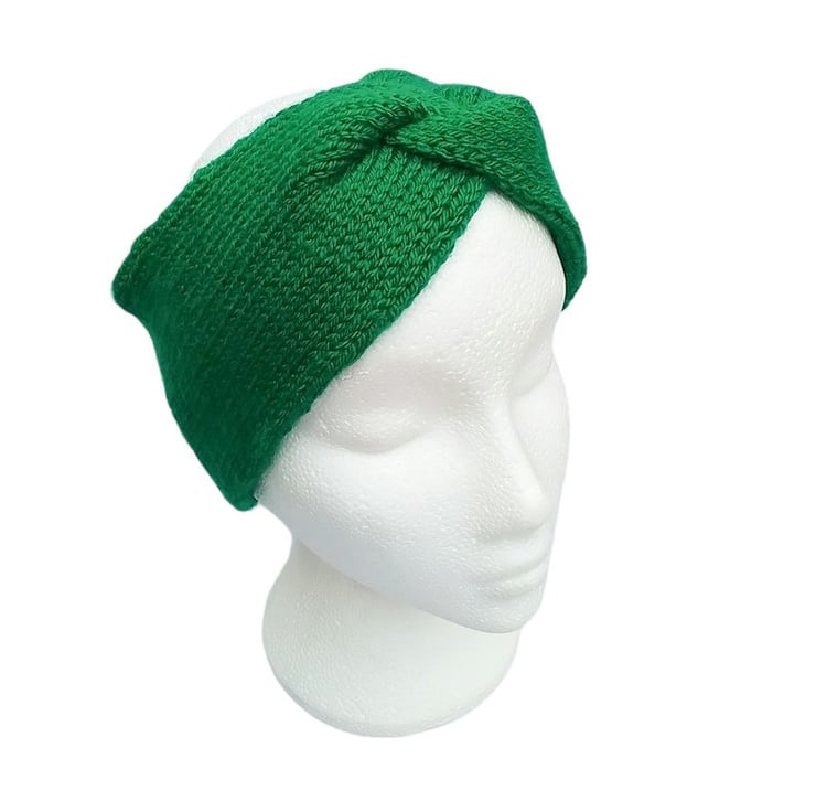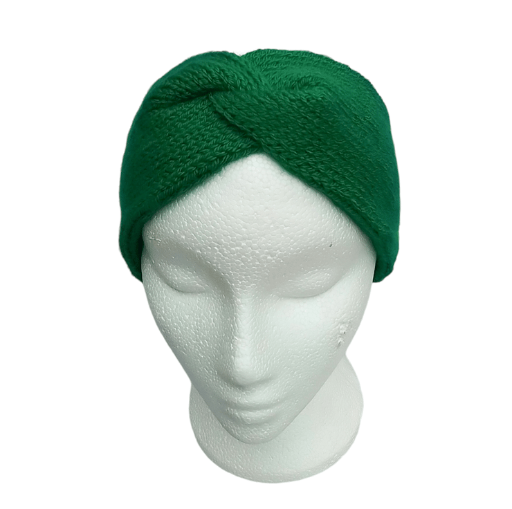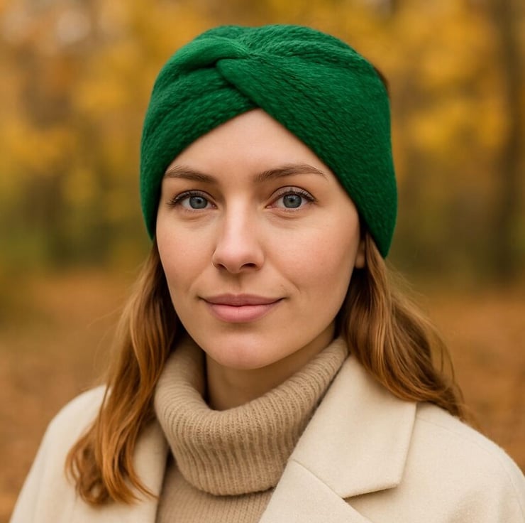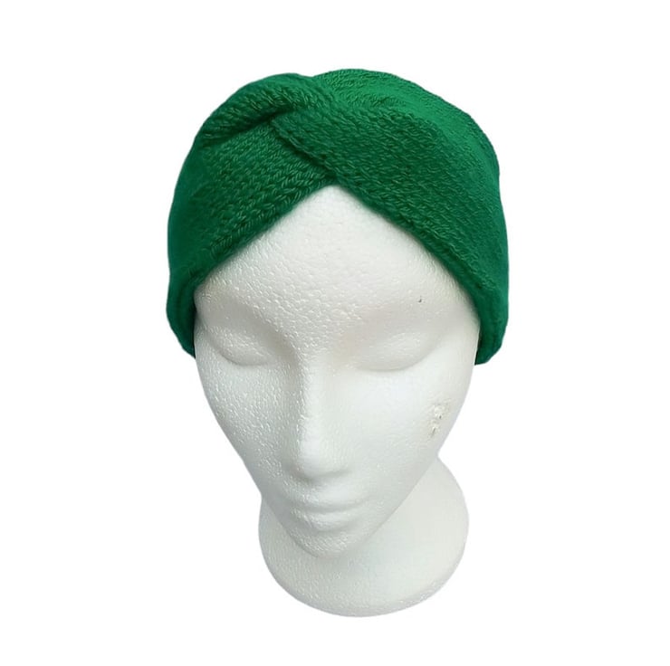Hand-Knitted Twisted Headband in Turban Style, a fashionable and cosy accessory in a stunning emerald green color.