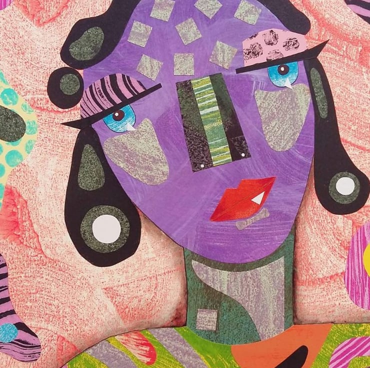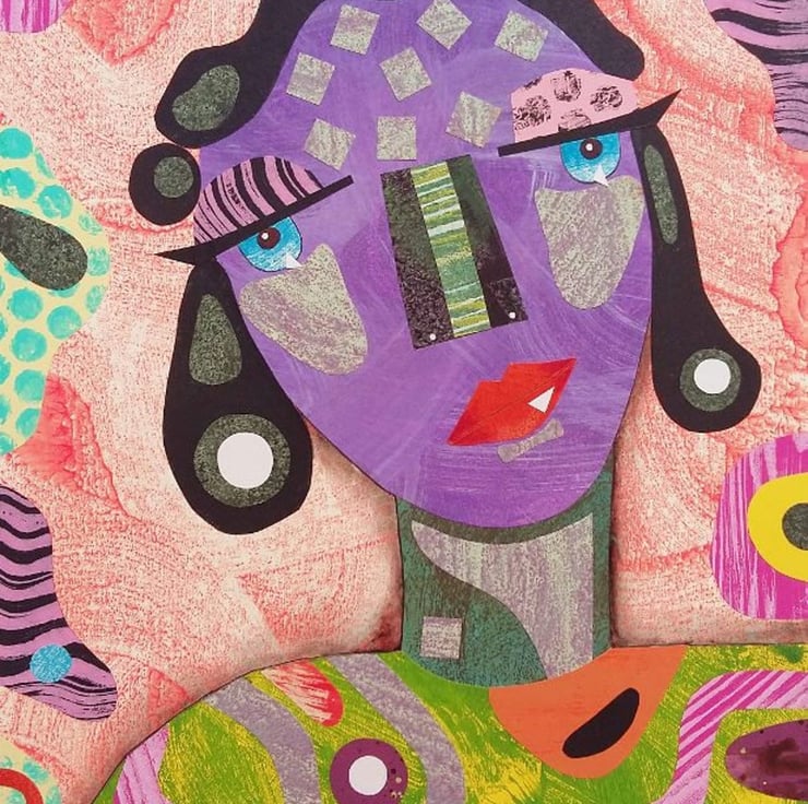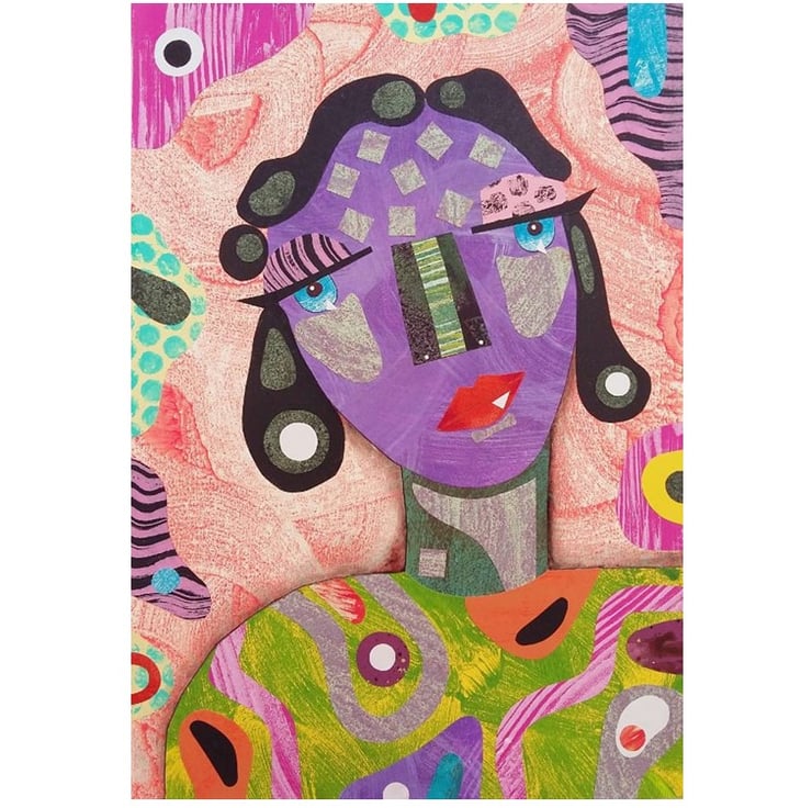 Striking, colourful and decorative original collage painting on light card, created with acrylic paint and my own painted and printed collage papers. Measuring a touch under 9.5 x 13.5 inches, this artwork has the WOW factor! This is a 100% hand crafted artwork which is is signed on the front with a collaged "B" and hand signed on the back by Bea. The artwork comes to you unframed - framed photos for illustration purposes only.