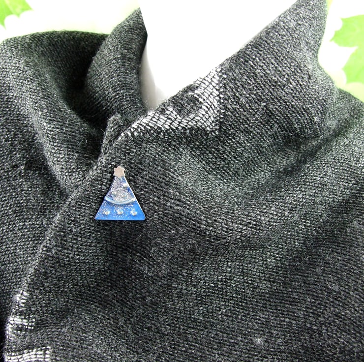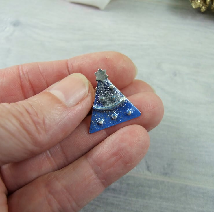 I created this little festive tree using copper sheet. I hand drew and cut the triangle shapes then sand, refine and solder on some silver elements to decorate then add a layer of blue enamels with a glittery overlay. Sterling silver pin and butterfly clip (also comes with a rubber safety push pin cover to use instead of the butterfly clip)