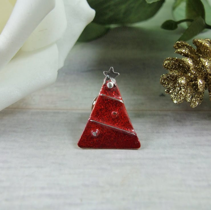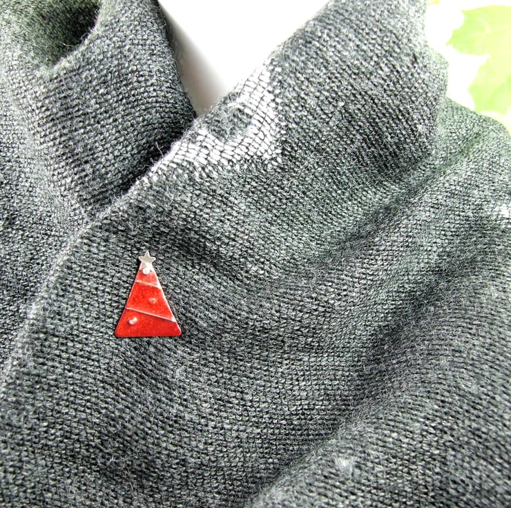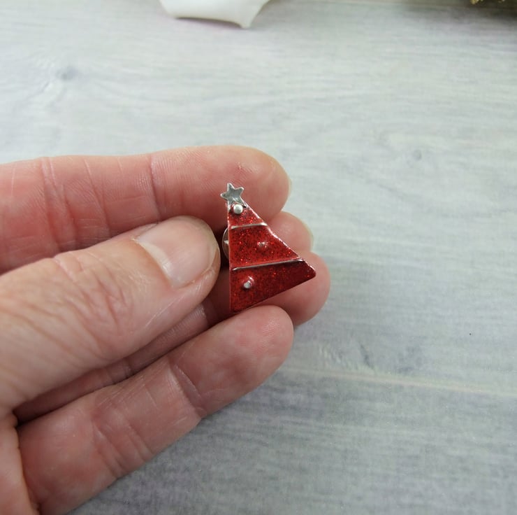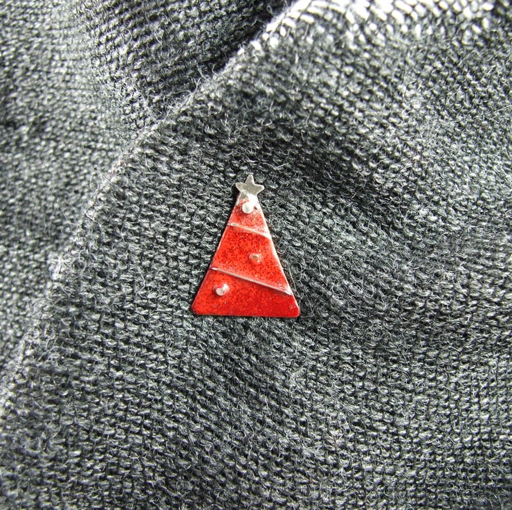 I created this little festive tree using copper sheet. I hand drew and cut the triangle shapes then sand, refine and solder on some silver elements to decorate then add a layer of red enamels with a glittery overlay. Sterling silver pin and butterfly clip (also comes with a rubber safety push pin cover to use instead of the butterfly clip)