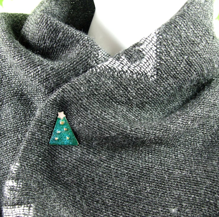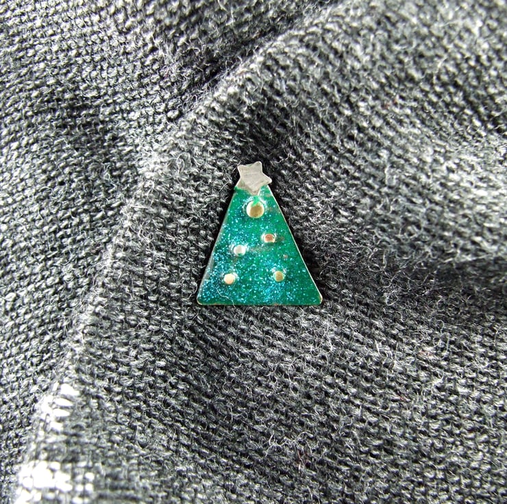 I created this little festive tree using copper sheet. I hand drew and cut the triangle shapes then sand, refine and solder on some silver elements to decorate then add a layer of green enamels with a glittery overlay. Sterling silver pin and butterfly clip (also comes with a rubber safety push pin cover to use instead of the butterfly clip)