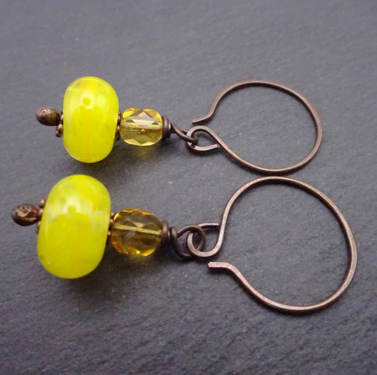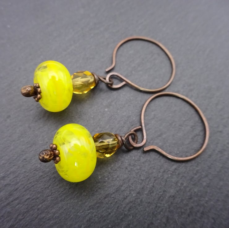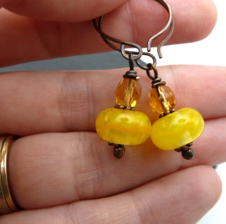 A pair of earrings made with handmade copper ear wires, yellow glass beads and handmade lampwork glass beads.
