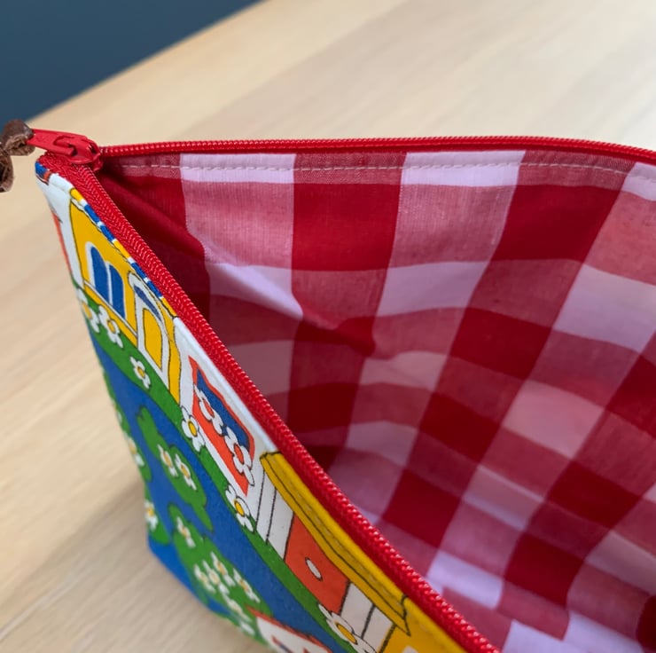 Daisy walk was a popular children’s design for jonelle in the 1970s. It is complemented by a red and white gingham lining. There is a layer of interfacing between the layers.