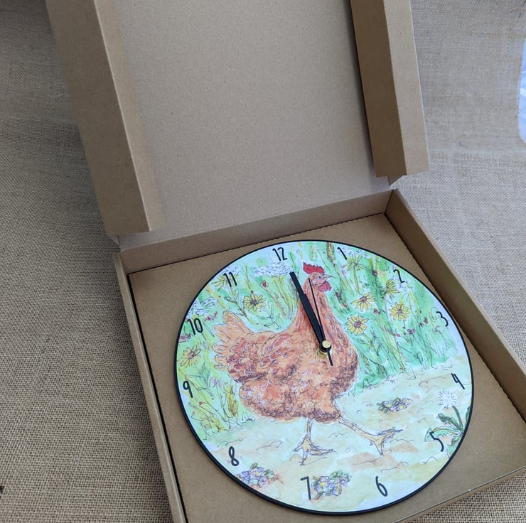 Clock made in the UK and printed with my original artwork of a determined hen walking alongside a wildflower meadow. The clock is made of FSC sourced timber with metal hands. The clock has a quartz movement powered by a AA battery (not included)