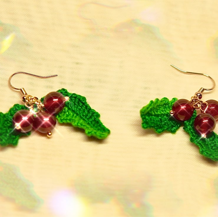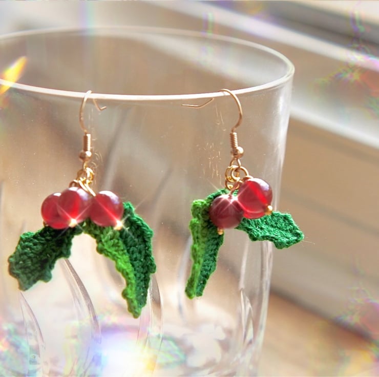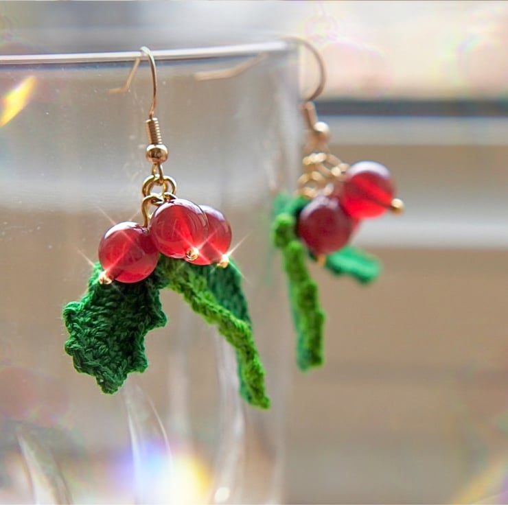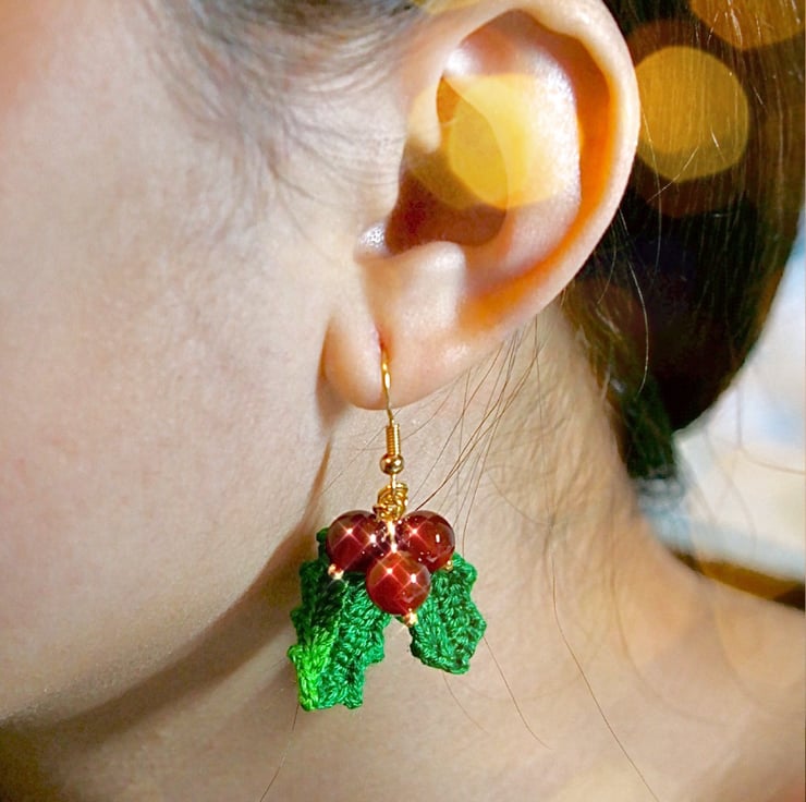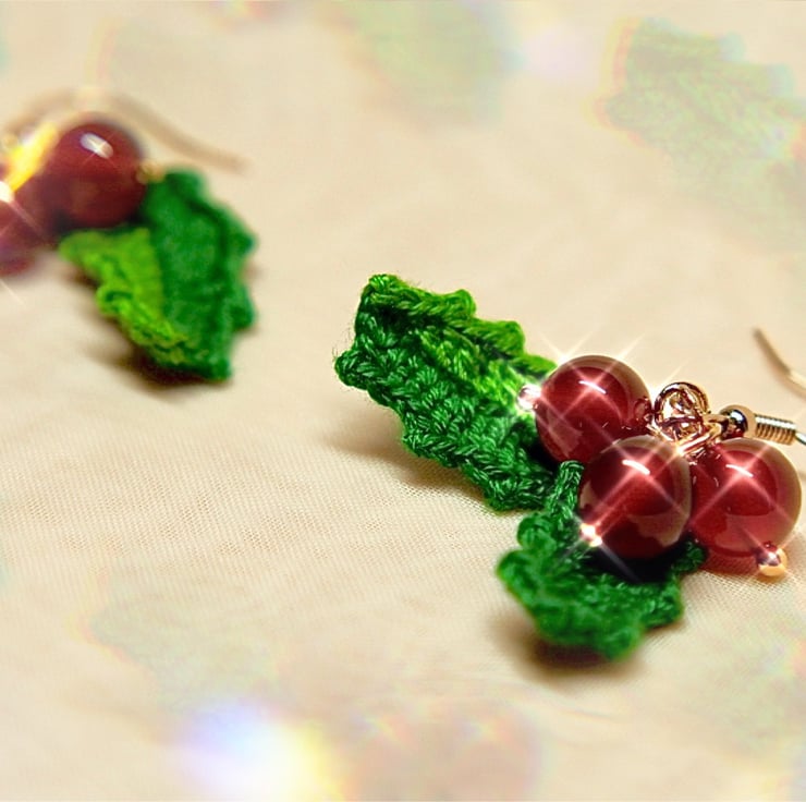 Christmas Crochet Dangle Earrings made with 8mm Red Carnelian and Embroidery Threads.