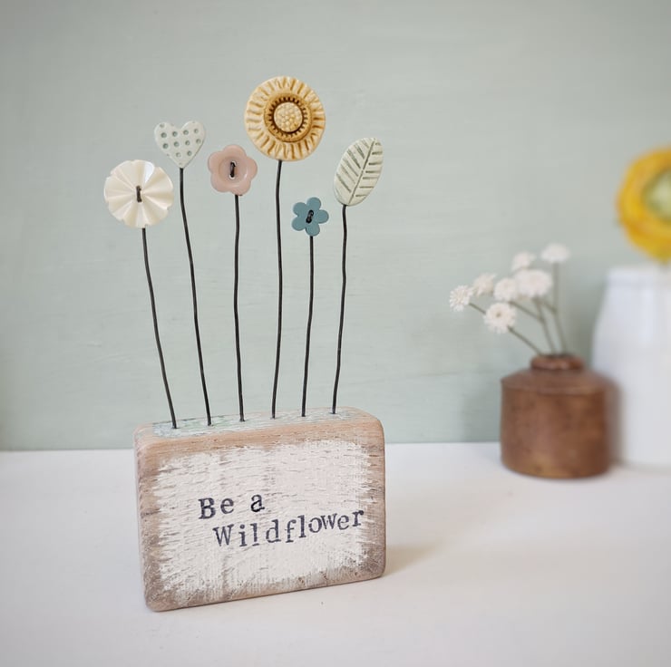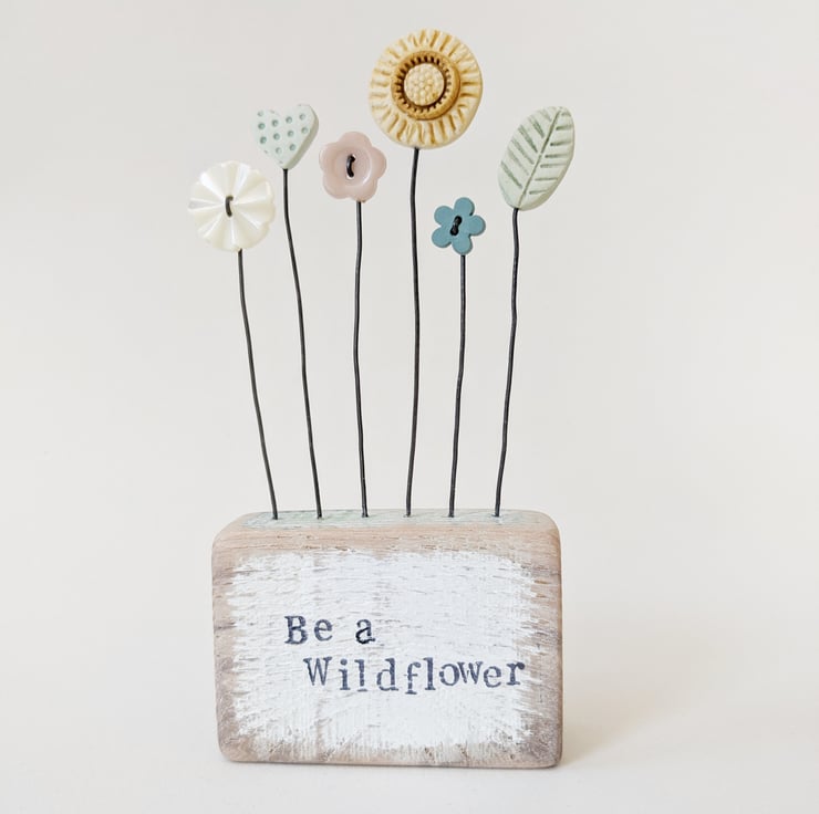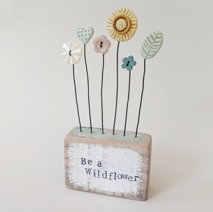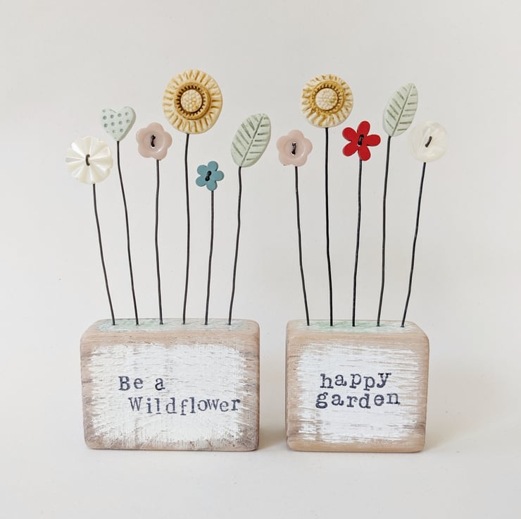 Clay and button flowers grow in a row in this little garden. They stand on their wire stalks in a painted wooden block.