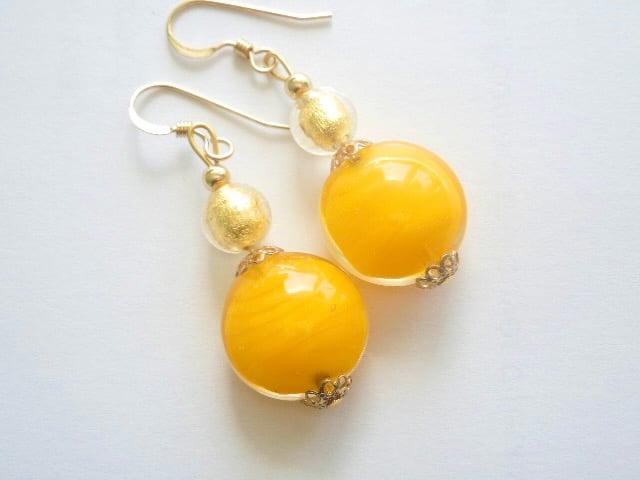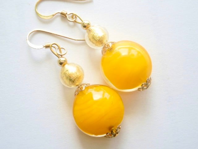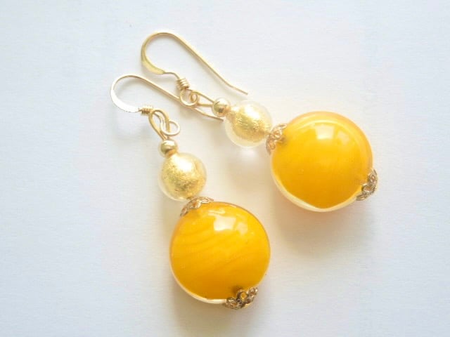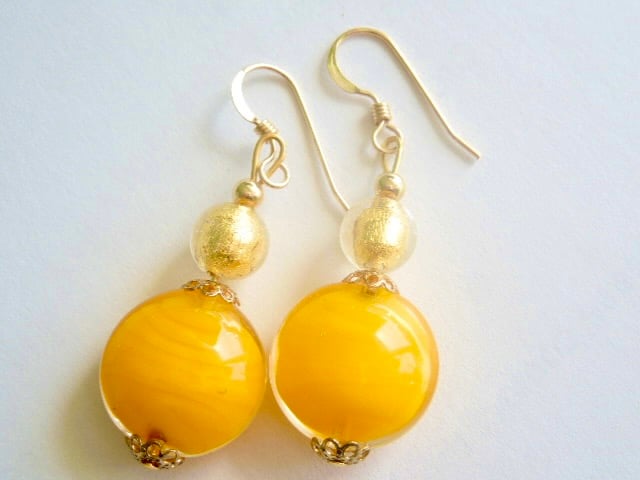 Murano glass earrings with rich yellow Murano glass lentil beads (14mm) and 24k gold foiled Murano glass round beads and gold filled round beads. These beads are a wonderful colour enhanced by gold findings. The earrings hang from 14k gold filled ear wires and measure 25mm in length excluding wires. They are presented in a pretty gift pouch and will be posted with track and sign delivery.
