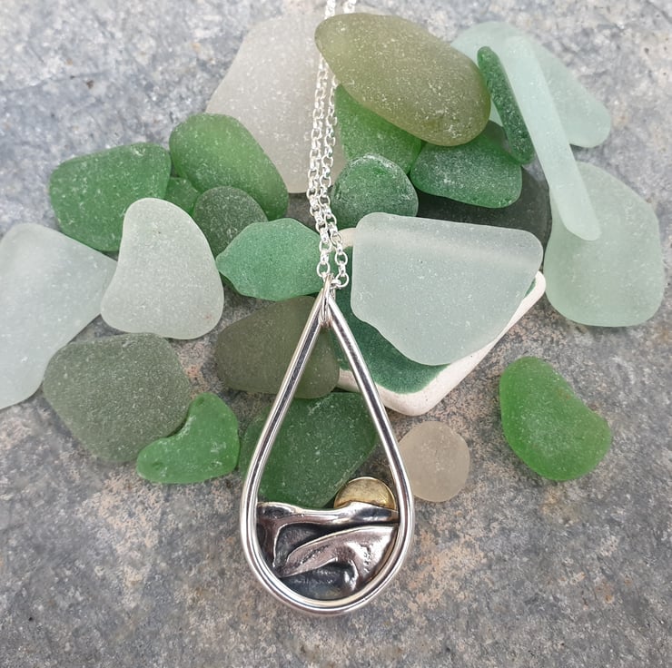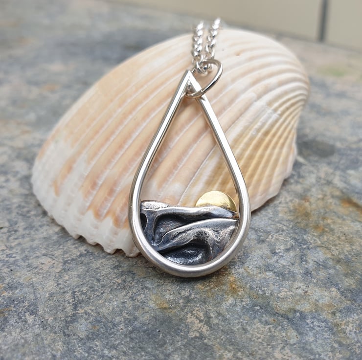 This pendant is perfect for anyone who loves the great outdoors and reminds me of the sun rising or setting over sea. The sterling silver teardrop is formed from 2mm round wire and has a layer of fine silver which has been folded to create the wave like texture with a brass sun. It measures approx 36mm long and 20mm across and hangs from a sterling silver belcher chain which fastens with a bolt clasp.