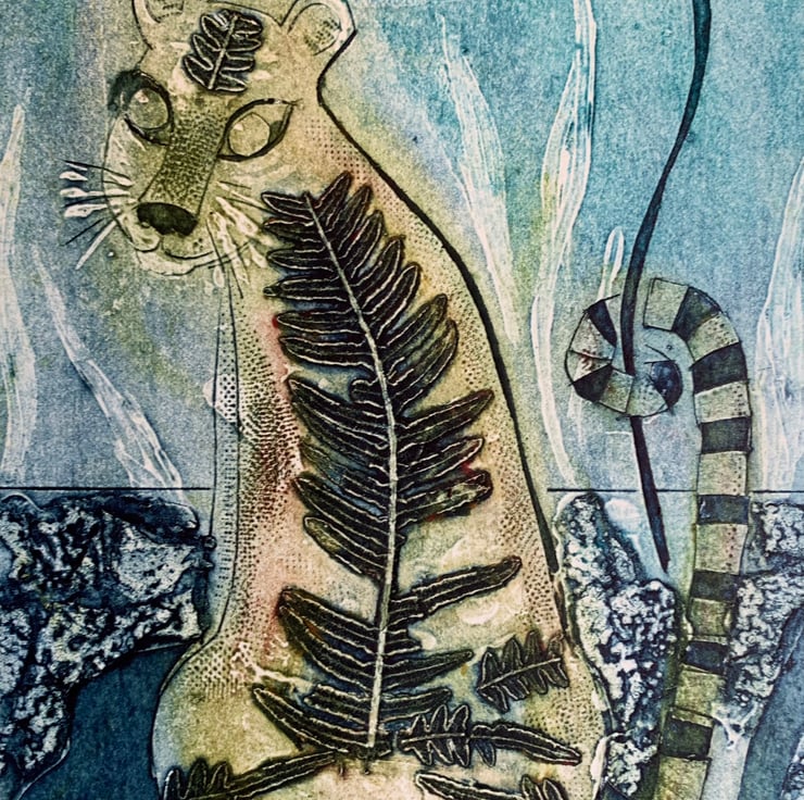 When I am out on my walks I am more often than not coming back with bits of leaves and grasses which can come in handy for printmaking. The bracken leaf which I used on the tigers back was the starting point for this design.