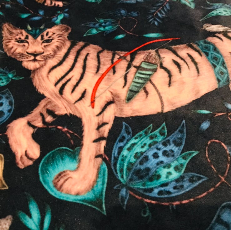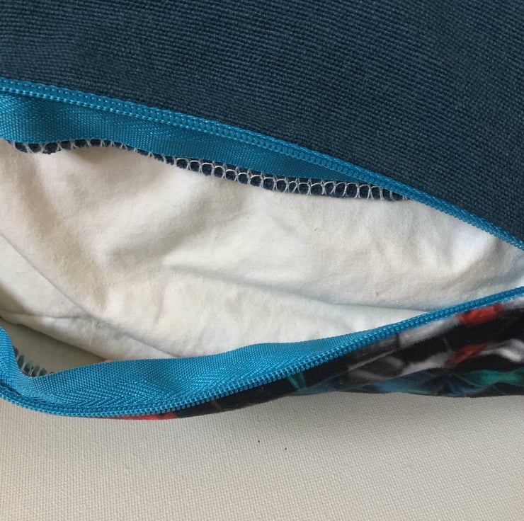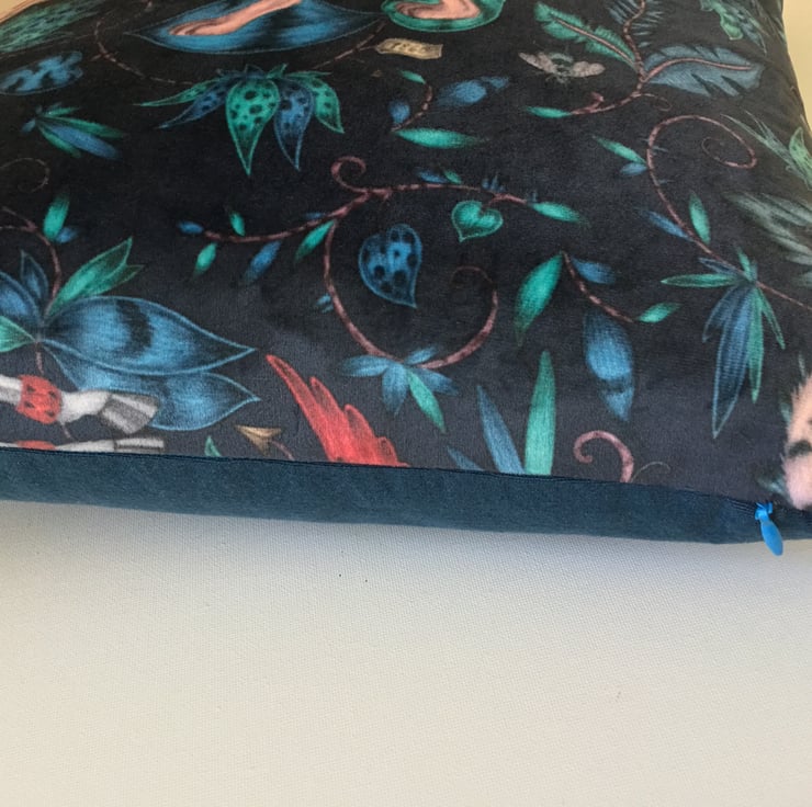 Cushion cover made from a beautiful soft velvet fabric from Clarke & Clarke in collaboration with Emma J Shipley who is known for her fantastic bold wildlife designs. The cushion has a concealed zip and a petrol blue linen fabric reverse.