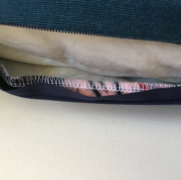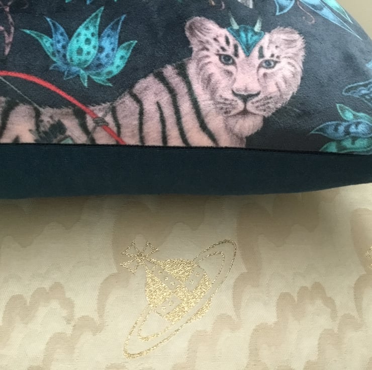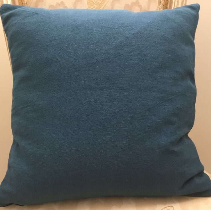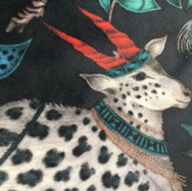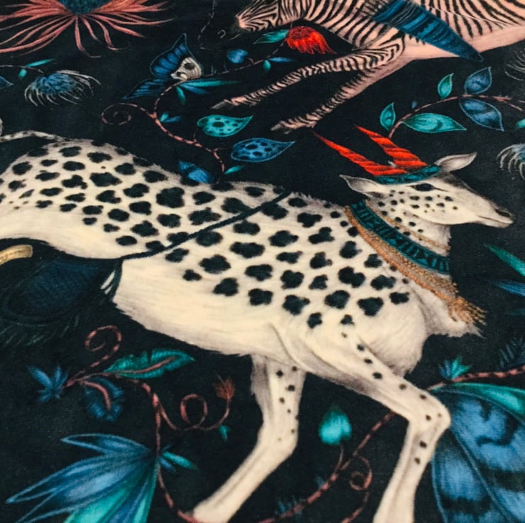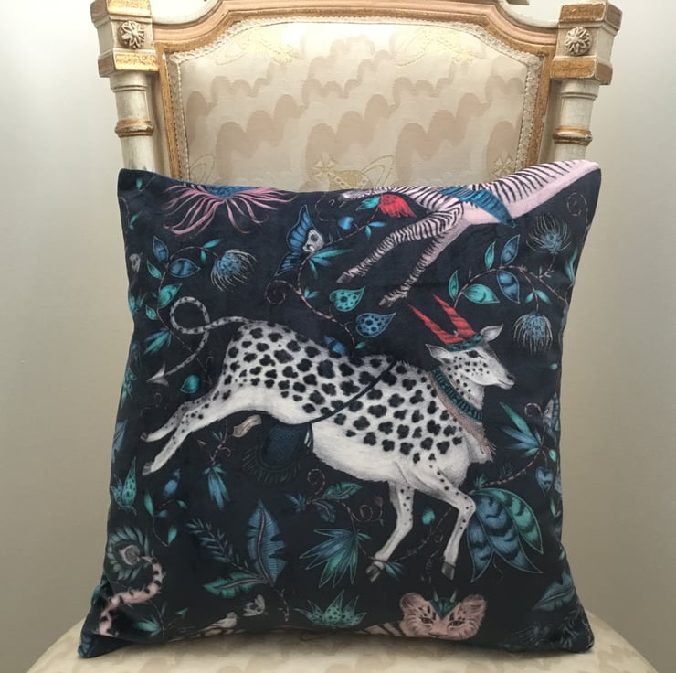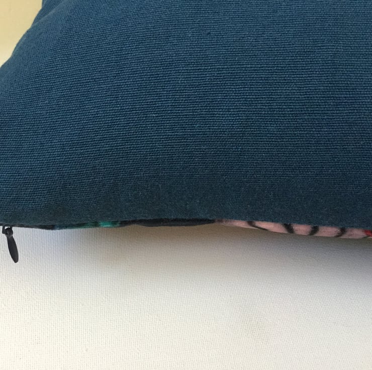 Cushion cover made from a beautiful soft velvet fabric from Clarke & Clarke and designed by Emma J Shipley who is well known for her bold wildlife designs. The cushion cover has a concealed zip and a petrol blue linen reverse. Fits a 40cm x 40cm feather pad, this is for the cover only, but shown in the photos with this size pad. Overlocked seams for strength and to help prevent fraying.
