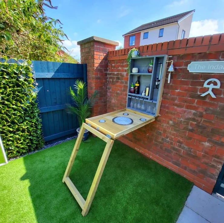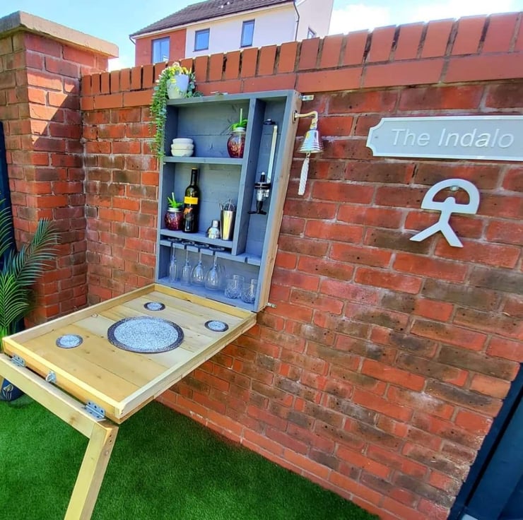 A stunning wall bar with fold out table (and folding legs). Suitable for both indoor and outdoor use, made from new pressure treated timber. Inside you'll find room for all of your favourite drinks, including a fixed bracket 50ml optic. Measuring 90cm tall x 67cm wide.