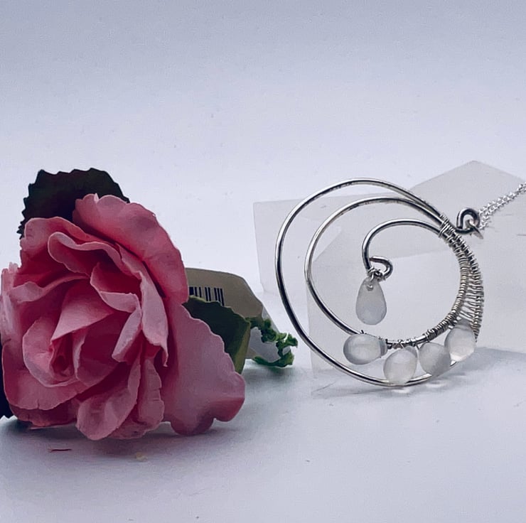 50% off! A spiral of silver plated wire is adorned with tiny frosted glass droplets. Thus pendant has a charm all of it’s own and may be worn with any garment of choice. This versatility makes it the ideal inexpensive gift.