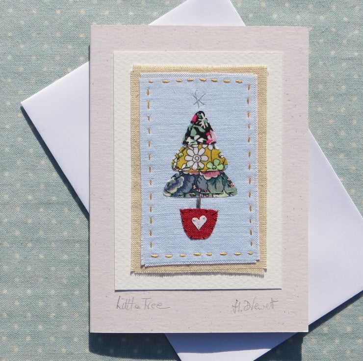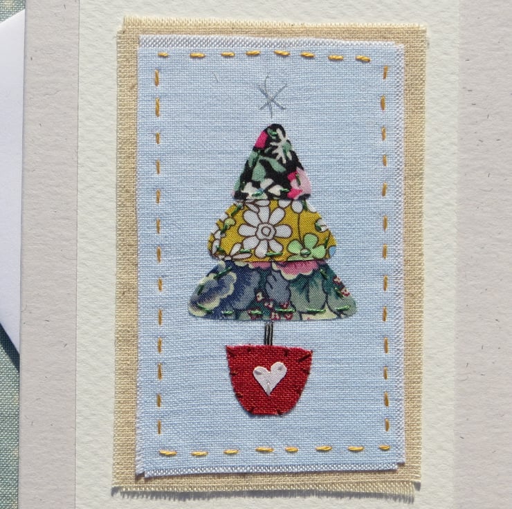 A miniature hand-stitched applique Christmas tree, worked on a piece of hand-dyed recycled cotton. A popular design, cheerful and bright, each one I make is unique as fabrics and threads vary. This one is made from Liberty Tana Lawn fabrics.