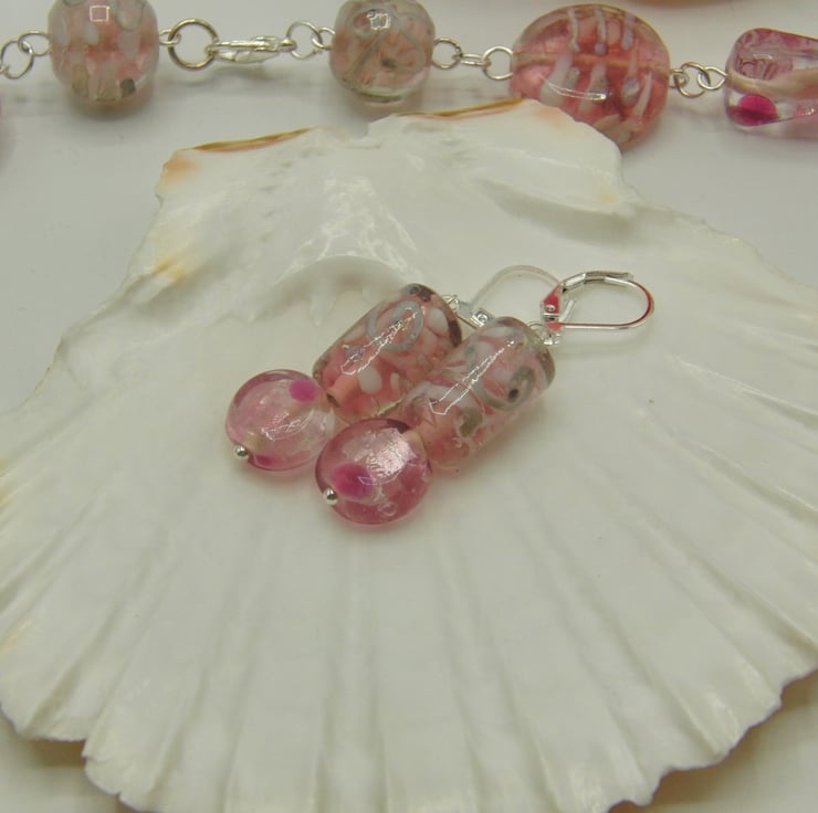 This pretty jewellery set comprises a necklace and a pair of earrings. It would be great to wear everyday or for an evening out. The necklace and earrings set is made using different shapes including oval, rectangular, round and coin shapes and a central large oval shaped beads in sizes ranging from 30 mm to 10 mm of pink glass and lampwork beads linked together with jump rings. The necklace is 24 inches (61 cm) long and has a silver lobster clasp. The earrings have a 15 mm x 10 mm cylinder bead and a 10 mm coin bead suspended on silver plated lever backs. The necklace will be dispatched wrapped in tissue paper in an organza bag and delivered via Royal Mail first class post. The set would look great for everyday wear and it would also make a lovely gift for a fashion conscious lady of your acquaintance.