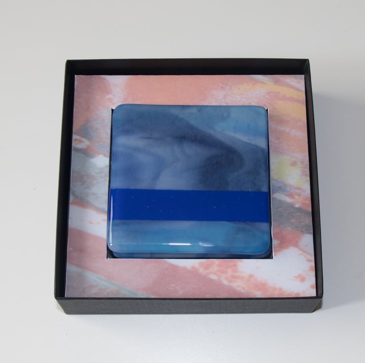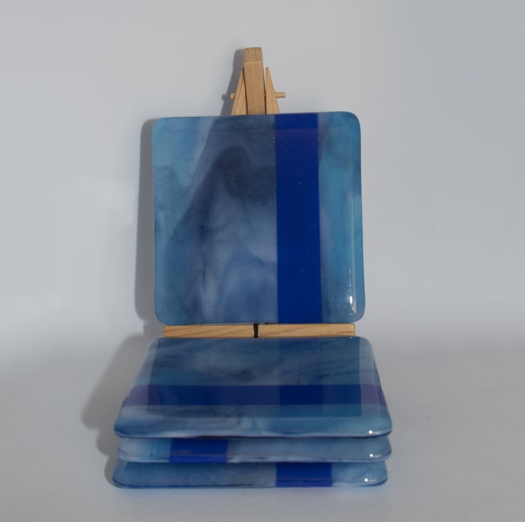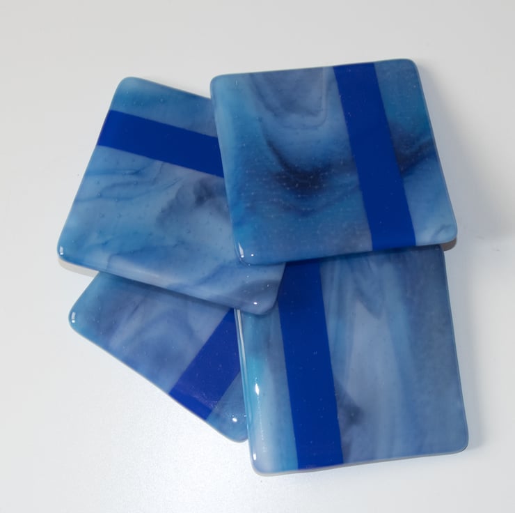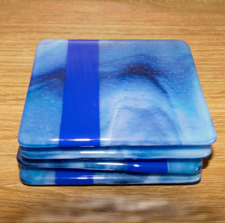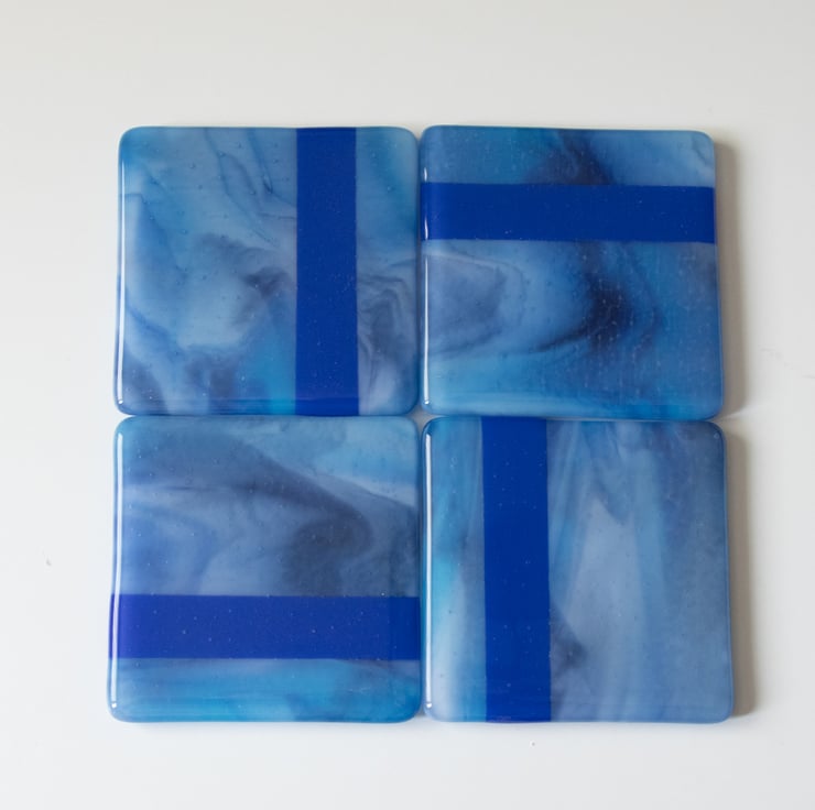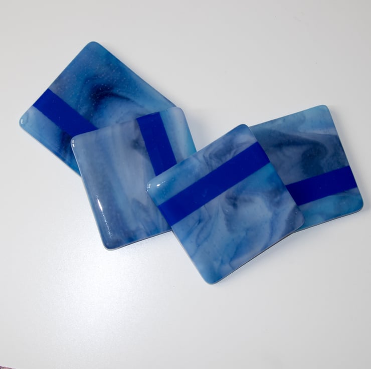 Each coaster uses the same design - a square of streaky Blue & White with a Dark Blue stripe. They are each approximately 10 cm square and have little rubber feet fixed to the base to stop them from slipping around.